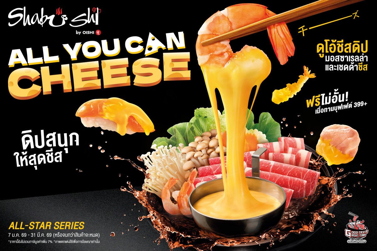 ชาบูชิ (Shabushi) สร้างปรากฏการณ์ความอร่อยสุดชีส มอบรสชาติความสุข…ไม่สิ้นสุด ภายใต้แคมเปญ ALL-STAR SERIESโดยครั้งนี้ขอจัดหนักเอาใจสายชีส ALL YOU CAN CHEESE ด้วย “ดูโอ้ชีสดิป” ชีสดิปสูตรพิเศษ ที่ผสานชีสมอสซาเรลลาเข้ากันอย่างลงตัวกับชีสเชดด้ารสชาติเข้มข้น…หอมมัน จะดิปกับเมนูอะไร ๆ ก็อร่อยโดนใจไปหมด พร้อมเสิร์ฟฟรีไม่อั้น เมื่อรับประทานบุฟเฟต์ 399 บาท+ ขึ้นไปนอกจากนี้ ยังสามารถอร่อยได้เต็มที่กับเมนูมาตรฐานอื่น ๆ อาทิ เนื้อฮารามิ หมูสไลซ์ เบคอน กุ้ง หมึก และอีกมากมายล้นสายพาน ทั้งซูชิและของทอดสไตล์ญี่ปุ่น พร้อมเครื่องดื่ม ผลไม้ และไอศกรีม ตั้งแต่ 7 มกราคม 2569 – 31 มีนาคม 2569 หรือจนกว่าสินค้าจะหมด