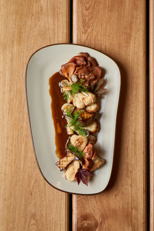 เริ่มจาก “ป่าดิบเขา” ที่อุดมไปด้วยเห็ดป่าและสมุนไพรหลากชนิด เชฟได้รังสรรค์เมนู Miang-Kam Salad ใบเมี่ยงคำและยำใบชาหมัก เสิร์ฟพร้อมกุ้งกรอบและถั่วแมคคาเดเมียคั่ว ให้รสสดชื่นและช่วยกระตุ้นระบบย่อยอาหารได้อย่างเป็นธรรมชาติ ตามด้วย Grilled Mushroom Steak และ Mushroom Fried Rice ที่ใช้เห็ดนานาชนิด อาทิ เห็ดสมองลิง, เห็ดนางรมเทา, และเห็ดนางรมแดง ผสมผสานกลิ่นหอมของสมุนไพรพื้นบ้าน และรสกลมกล่อมที่ปลุกความรู้สึกผ่อนคลายเมื่อได้ลิ้มลอง
