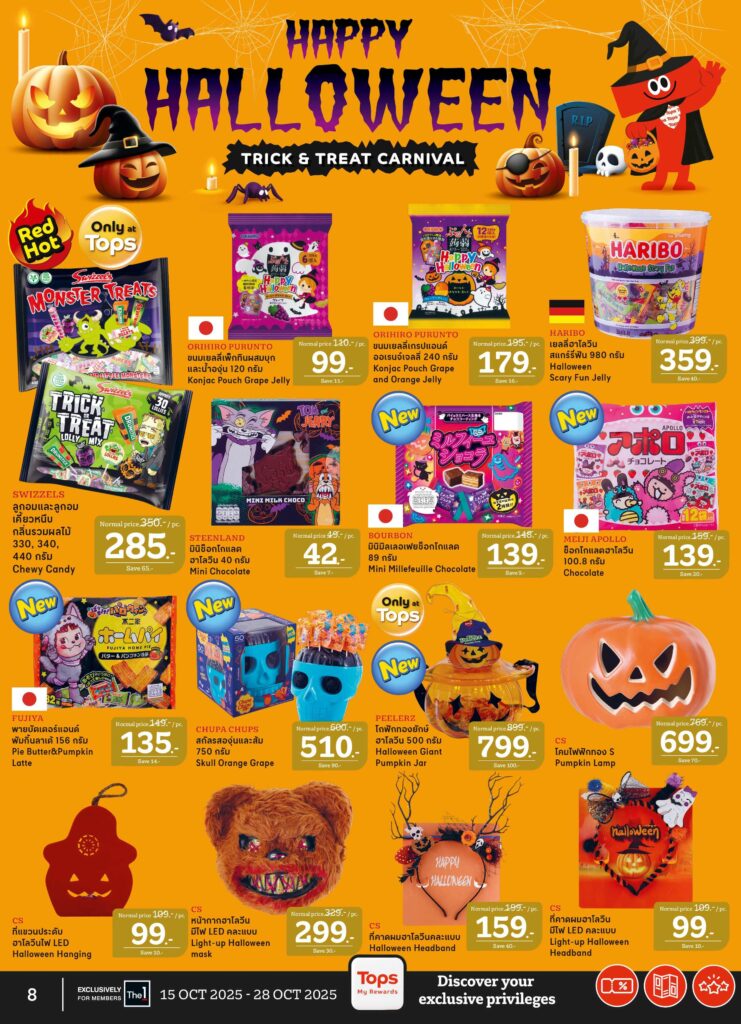 ท็อปส์ ธุรกิจกลุ่มฟู้ด ในเครือเซ็นทรัล รีเทล ร่วมต้อนรับเทศกาลแห่งความหลอนวันฮาโลวีน จัดงาน “Happy Halloween: Trick & Treat Carnival” เนรมิตพื้นที่ให้เป็นดินแดนแห่งความสนุกสุดสยองขวัญ รวบรวมขนมนำเข้าหายากจากทั่วโลกที่มาในแพ็กเกจธีมฮาโลวีน และไอเทมพร็อพสำหรับปาร์ตี้ฮาโลวีนไว้ครบจบในที่เดียว ให้เหล่านักช้อปได้เตรียมพร้อมสำหรับการ Trick & Treat พิเศษกับสินค้า “Only at TOPS” อย่าง Peelerz โถฟักทองยักษ์ฮาโลวีน, SWIZZELS ลูกอมและลูกอมเคี้ยวหนึบกลิ่นรวมผลไม้ พร้อมด้วยขนมอีกหลากหลายแบรนด์ดัง อาทิ ORIHIRO PURUNTO, MEIJI APOLLO, HARIBO, CHUPA CHUPS, BOURBON ฯลฯ พร้อมกันนี้ยังอุปกรณ์ของตกแต่ง สำหรับปาร์ตี้! อาทิ โคมไฟฟักทอง, หน้ากากฮาโลวีลมีไฟ LED, ที่คาดผมสุดเก๋, หมวกฮาโลวีนแม่มด, เครื่องประดับผมฮาโลวีนแบบมีผ้าคลุม หรือเพิ่มความหลอนด้วยเทียน LED ลายหัวกะโหลก และพลาดไม่ได้กับเบเกอร์รี่แสนอร่อยสุดหลอน จาก The Baker อาทิ ขนมปังไส้กรอกมัมมี่, ราสเบอร์มอนสเตอร์เค้ก, สไปเดอร์ช็อกโกแลตซอฟคุกกี้, โกสท์กาลิคแฟลทเบรด, ฮาโลวีนบราวนี่ ฯลฯ