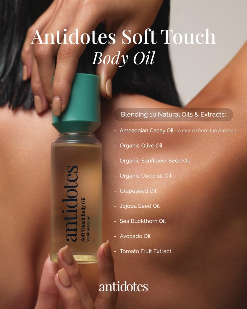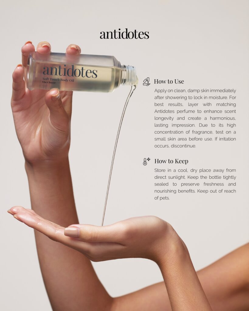 Antidotes Soft Touch Body Oil ใช้ได้ทั้งตอนเช้าและก่อนนอน ช่วยล็อกความชุ่มชื้น ให้ผิวเนียนนุ่มแบบซาติน พร้อมกลิ่นหอมชัดเจน ให้ทุกความใกล้ มั่นใจ หอมชัด สะกดทุกสัมผัส เหมาะกับทุกสภาพผิว โดยเฉพาะคนที่ใส่ใจการดูแลตัวเองหลังวันหนัก ๆ หรือชอบเติมบุคลิกก่อนออกจากบ้านในตอนเช้า ทุกกลิ่นมีให้เลือก 2 ขนาด ได้แก่ 100 ML ราคา 980 บาท และ 30 ML ราคา 350 บาท วางจำหน่ายที่ Antidotes สาขา Central World, ICONSIAM, Siam Discovery, Pop-Up Central Park และช่องทางออนไลน์ของแบรนด์ทุกช่องทาง