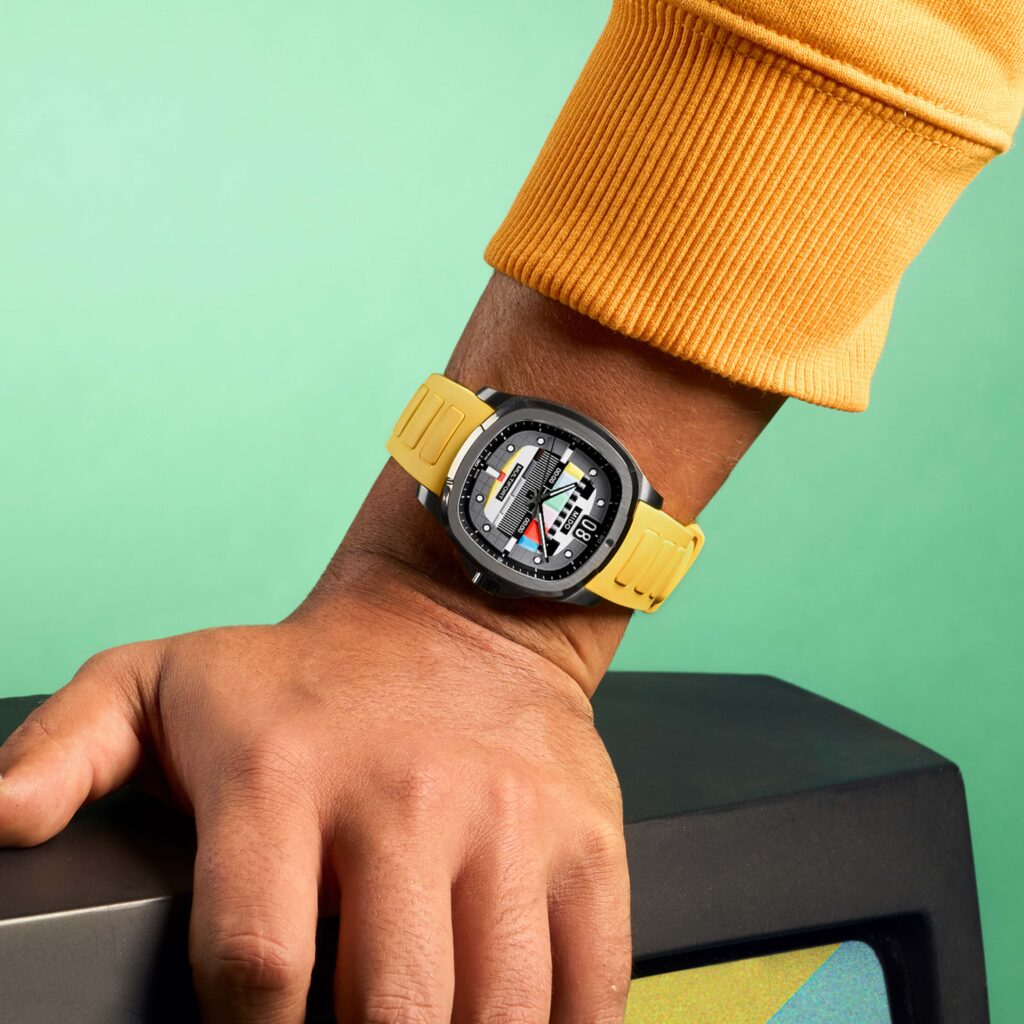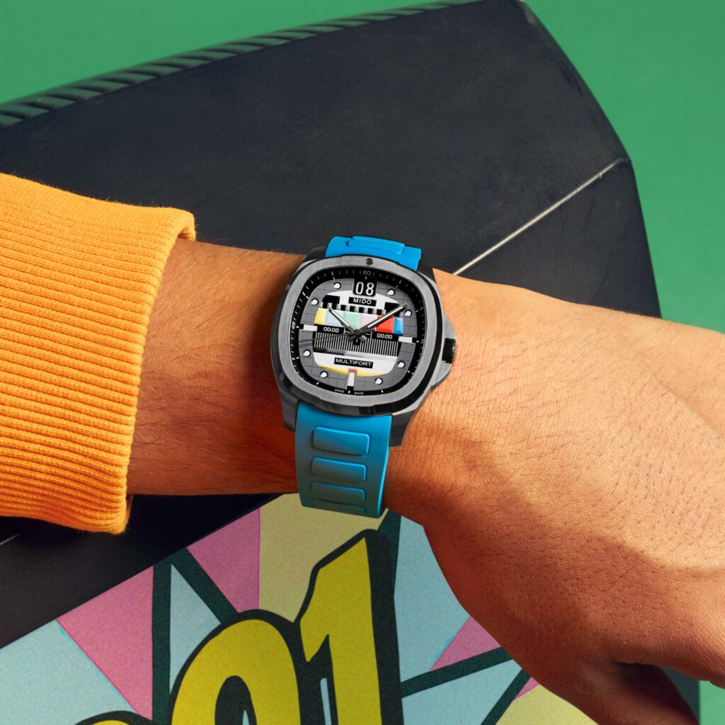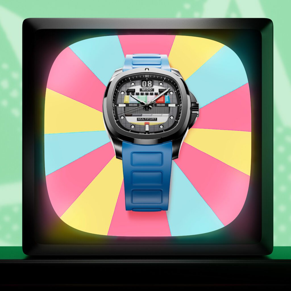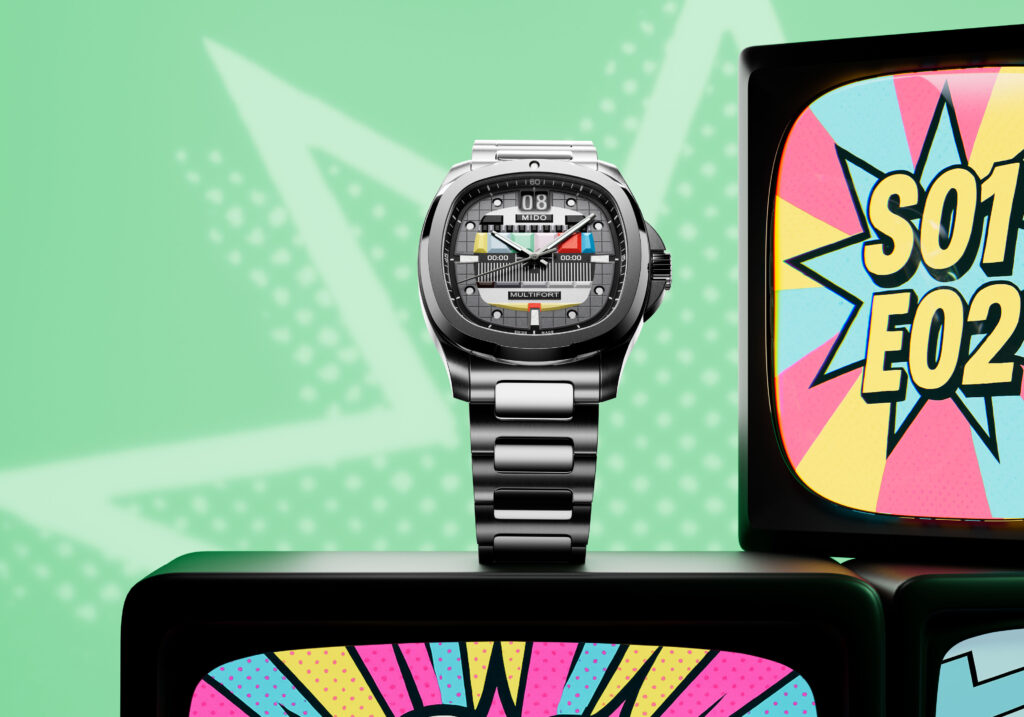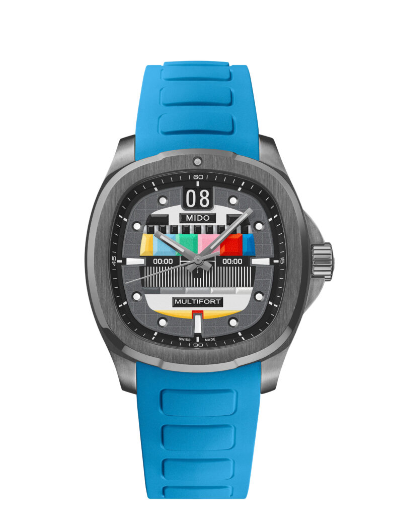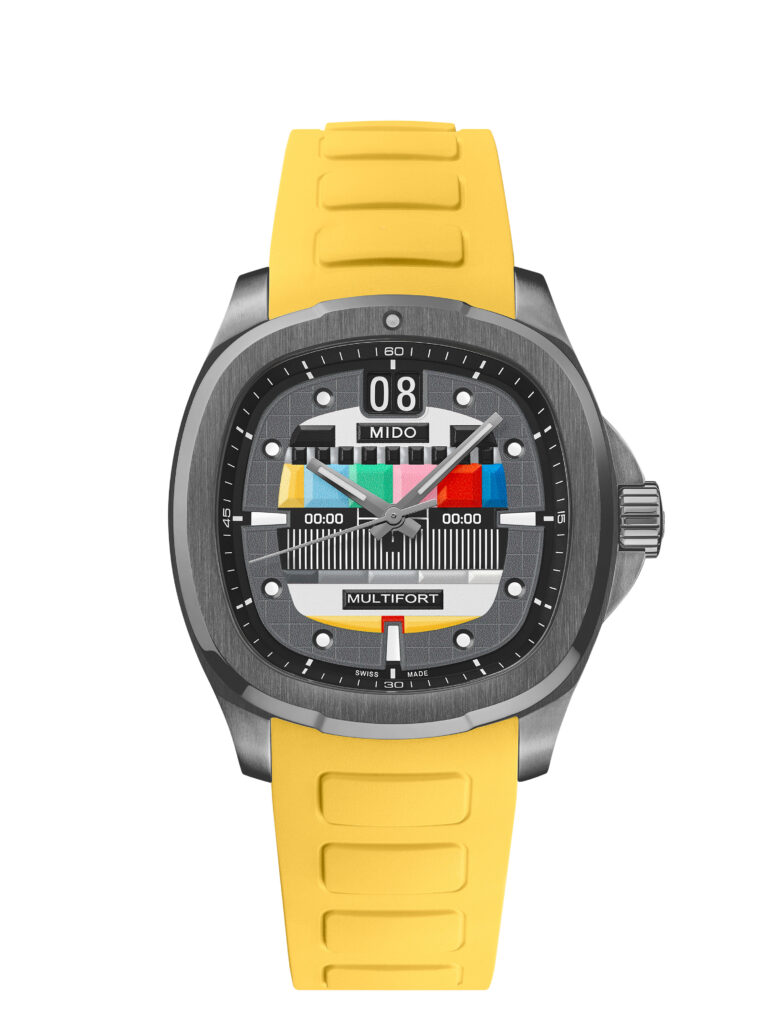 ในครั้งนี้ มิโด (MIDO) กลับมาจุดประกายและเติมสีสันให้วงการเรือนเวลาอีกครั้งกับผลงานล่าสุดในคอลเลกชั่นพิเศษ มัลติฟอร์ท ทีวี บิ๊ก เดท สเปเชียล อิดิชั่น เอส01อี02 (Multifort TV Big Date Special Edition S01E02) โดยหยิบยกแรงบันดาลใจจากยุคทองของจอโทรทัศน์มาถ่ายทอดผ่านหน้าปัดดีไซน์อันเป็นเอกลักษณ์ ที่จำลองลวดลายแถบคลื่นสัญญาณรบกวนหลากสีสุดคลาสสิกชวนให้รำลึกถึงวันวาน ให้กลายเป็นองค์ประกอบอันโดดเด่นบนหน้าปัดทรงทีวีสุดคลาสสิกที่สะท้อนกลิ่นอายเรโทร โดยคอลเลกชั่นนี้มาพร้อมตัวเรือนสเตนเลสสตีลเคลือบพีวีดีสีเทาขัดซาติน ชวนให้นึกถึงโลหะดิบ ซึ่งเป็นครั้งแรกที่วัสดุนี้ถูกนำมาใช้ในตระกูลของมัลติฟอร์ททีวีและเติมเต็มลุคโมโนโครมให้โดดเด่นยิ่งขึ้น ตัวสายถูกขัดเงาบริเวณข้อตรงกลาง และออกแบบให้เชื่อมต่อกับตัวเรือนได้อย่างเรียบเนียน นอกจากนี้ยังมาพร้อมสายนาฬิกา 3 สไตล์ ทั้งสายสแตนเลสสตีลที่ให้ลุคเรียบหรูดูสุขุม และสายนาฬิกายาง 2 เฉดสีที่มีดีไซน์ปั๊มลวดลายนูน ทั้งสีน้ำเงินสดเติมความเท่แบบโมเดิร์น และสีเหลืองสดที่ช่วยเพิ่มความสนุกสนานให้กับลุค มาพร้อมกรอบตัวเรือนขนาด 40 มิลลิเมตร บนหน้าปัดดีไซน์เฉพาะในธีมทีวีสุดวินเทจ ถ่ายทอดลวดลายคลื่นสัญญาณรบกวนหลากสีที่โดดเด่นตัดกับพื้นหลังสีเทา เสริมมิติให้โดดเด่นยิ่งขึ้นด้วยการขึ้นรูปนูนที่สะกดทุกสายตา โดยมีช่องแสดงวันที่ขนาดใหญ่ (Big Date) ที่ตำแหน่ง 12 นาฬิกา ใช้ตัวเลขสีขาวบนพื้นดำเพื่อให้อ่านค่าได้อย่างชัดเจน ด้านในหน้าปัดเสริมขอบแสดงนาที (Flange) เพื่อช่วยเพิ่มความชัดเจนในการอ่านเวลา