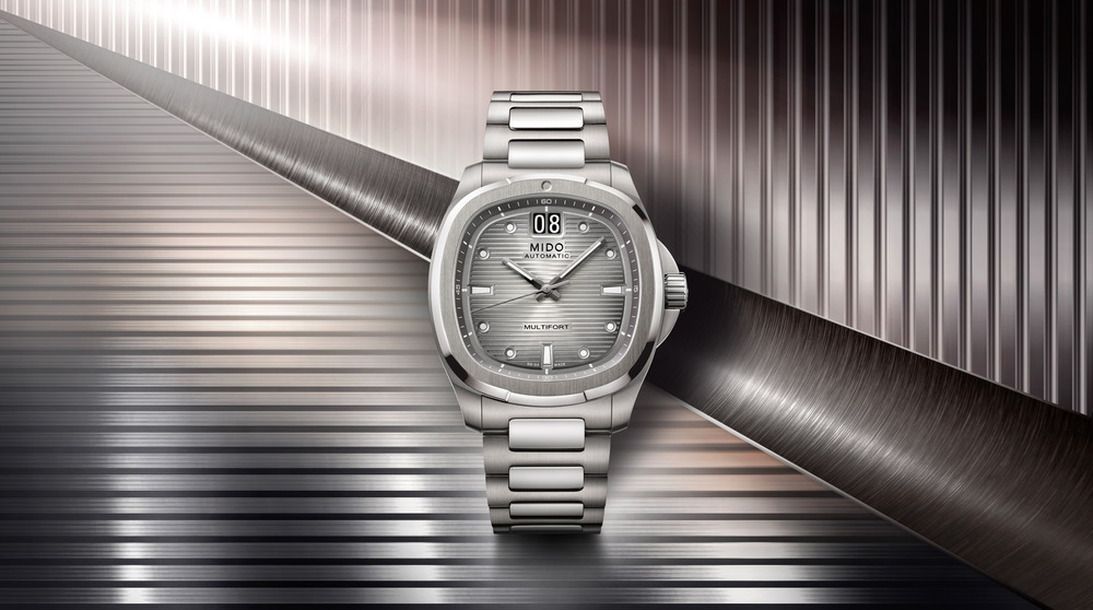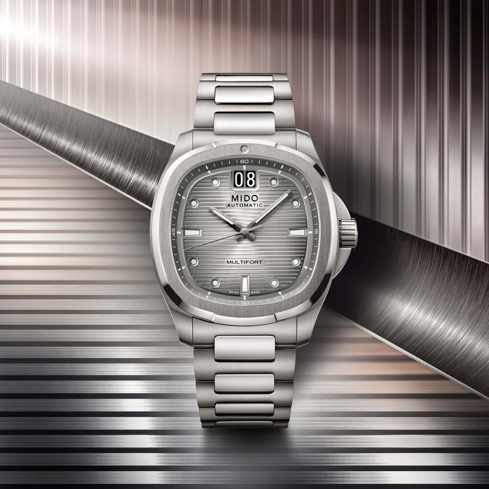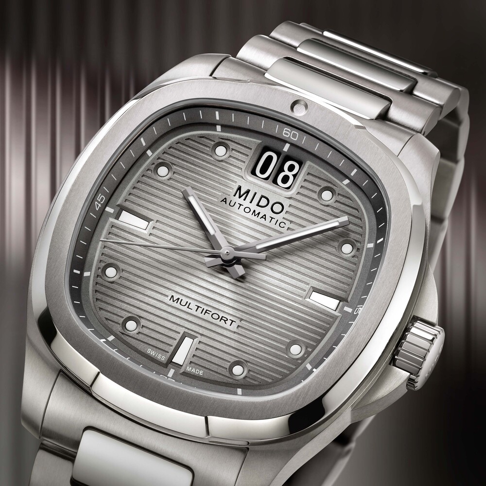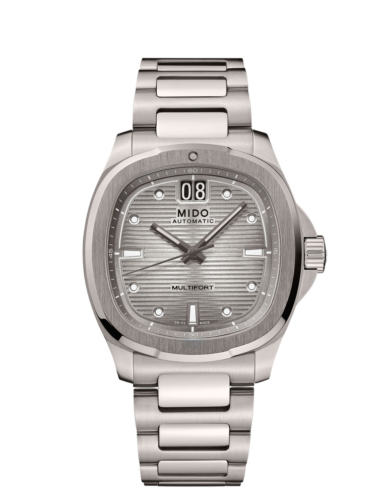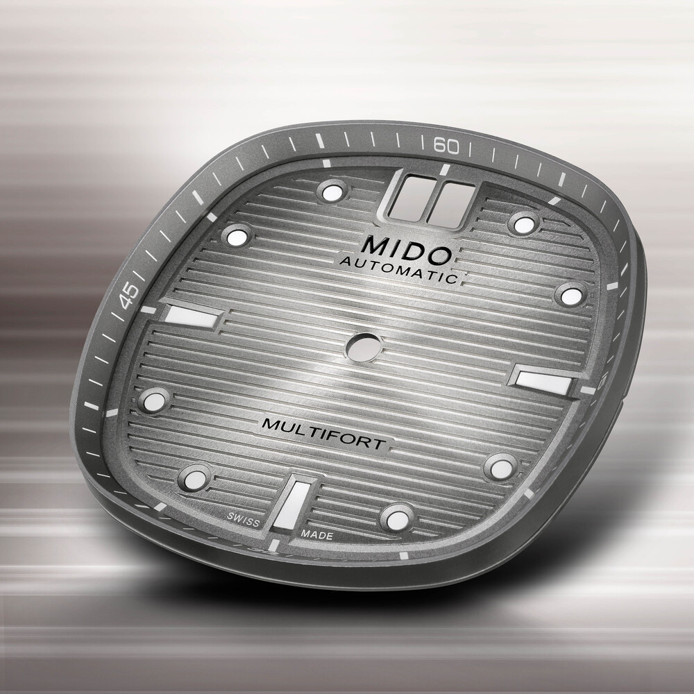 สำหรับเรือนเวลาดีไซน์ใหม่ล่าสุดจาก มิโด (MIDO) ในคอลเลกชัน มัลติฟอร์ท ทีวี บิ๊ก เดท ไทเทเนียม (Multifort TV Big Date Titanium) นำเสนอรูปลักษณ์ที่โดดเด่นในทุกมิติ ผ่านวัสดุไฮเทคระดับพรีเมียมอย่างไทเทเนียม (Titanium) มาพร้อมหน้าปัดทีวีสุดคลาสสิกที่กลับมาโลดแล่นอีกครั้งเพื่อตอกย้ำความสำเร็จของ มัลติฟอร์ท ทีวี บิ๊ก เดท (Multifort TV Big Date) โดยคอลเลกชั่นนี้มาพร้อมตัวเรือนไทเทเนียมขัดซาตินที่เพิ่มความหรูด้วยการขัดเงาที่ข้อต่อตรงกลาง ตัวสายถูกออกแบบให้เชื่อมต่ออย่างกลมกลืนกับตัวเรือน ด้วยหน้าปัดขนาด 40 มิลลิเมตร โดดเด่นด้วยการไล่เฉดสีเทาเงินในโทนโมโนโครม และตกแต่งด้วยเทคนิคซันเรย์ขัดซาตินพร้อมลายเส้นแนวนอนที่ละเอียดประณีต โดยมีช่องแสดงวันที่ขนาดใหญ่ (Big Date) ที่ตำแหน่ง 12 นาฬิกา ใช้ตัวเลขสีขาวบนพื้นดำเพื่อให้อ่านค่าได้อย่างชัดเจน และกรอบเบเซิลตกแต่งด้วยการพ่นทรายเพื่อเพิ่มมิติ