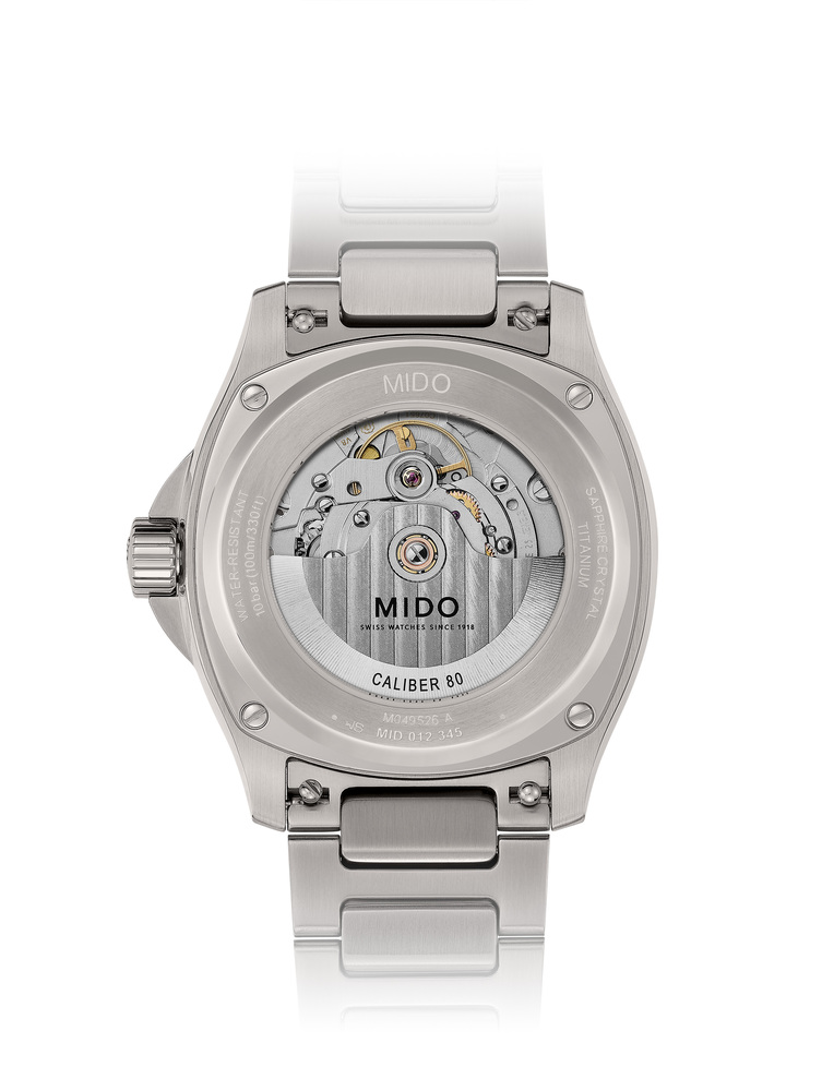 ด้านเข็มชั่วโมงและเข็มนาทีถูกเคลือบด้วยนิเกิลสีดำ ขัดเพชรทรงเหลี่ยม พร้อมเคลือบสารเรืองแสงสารเรืองแสงซูเปอร์ลูมิโนวา (Super-LumiNova®) เพื่อการอ่านค่าในที่แสงน้อยหรือยามค่ำคืน ขณะที่เข็มวินาทีถูกขัดเหลี่ยมเพชรเพื่อเพิ่มความเปล่งประกาย และด้านในหน้าปัดได้เสริมขอบแสดงนาที (Flange) เพิ่มความแม่นยำ ส่วนตัวเรือนด้านข้างติดตั้งเม็ดมะยมแบบขันเกลียว และระบบล็อกสายบานพับสลักโลโก้ MIDO ที่มาพร้อมแกนสปริงสำหรับถอดเปลี่ยนสายได้ง่าย และปุ่มกดเพื่อการสวมใส่สบาย ไม่รู้สึกหนักข้อมือ โดยฝาหลังมาในดีไซน์โปร่งใส เผยให้เห็นกลไกคาลิเบอร์ 80 (Caliber 80) ที่ตกแต่งด้วยลวดลาย Côtes de Genève และสลักโลโก้ MIDO พร้อมหมายเลขประจำเรือนอย่างประณีต สะท้อนความเชี่ยวชาญด้านงานฝีมือที่สืบทอดมาตั้งแต่ปี 1918 และครอบด้วยกระจกคริสตัลแซฟไฟร์ เคลือบสารกันการสะท้อนทั้งด้านในและด้านนอกเพื่อความคมชัดในการมองเห็นกลไกภายใน นาฬิกาเรือนนี้สามารถสำรองพลังงานได้นานสูงสุด 80 ชั่วโมง พร้อมบาลานซ์สปริงนิวาครอง (Nivachron™) ที่ช่วยต้านทานสนามแม่เหล็กและแรงกระแทกได้อย่างมีประสิทธิภาพ ทั้งยังรองรับการกันน้ำลึกถึง 10 บาร์ หรือ 100 เมตร