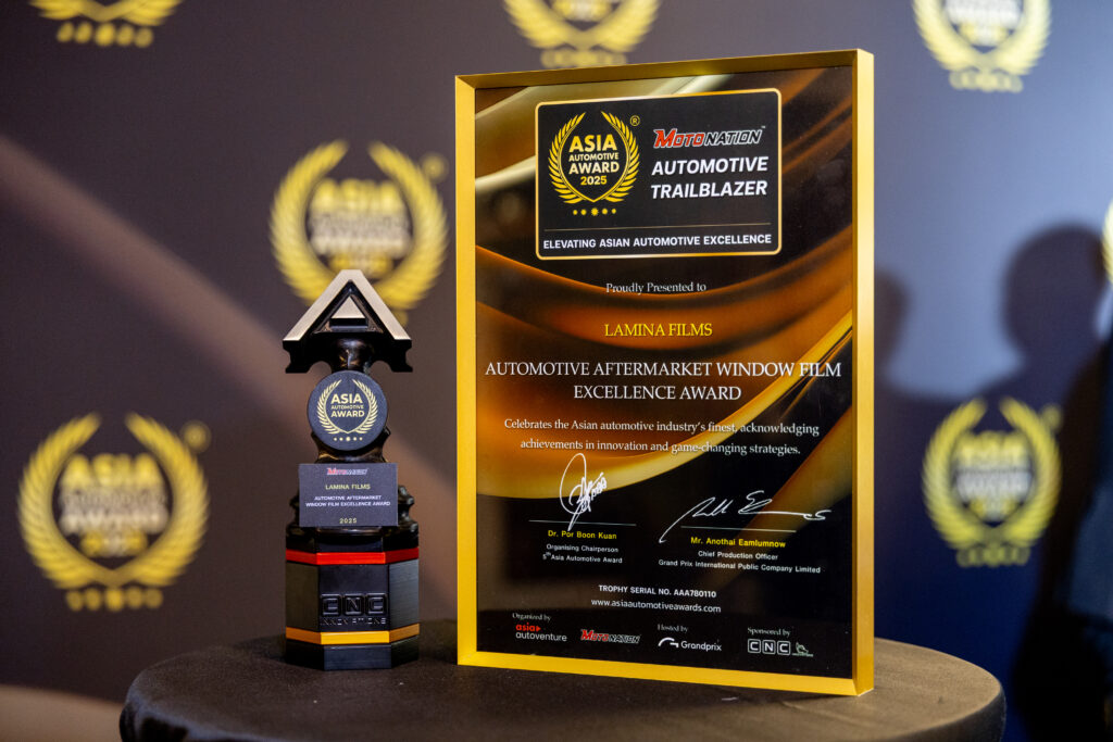 “ลามิน่าฟิล์ม” โดย นางสาวจันทร์นภา สายสมร ประธานเจ้าหน้าที่บริหาร บริษัท เทคโนเซล (เฟรย์) จำกัด รับรางวัลผลิตภัณฑ์ฟิล์มกรองแสงติดรถยนต์ยอดเยี่ยมระดับเอเชีย Automotive Aftermarket Window Film Excellent Award จาก Mr.Mohd Nazul Zahri CEO of Motonation ประเทศมาเลเซีย นายพีระพงศ์ เอี่ยมลำเนา CEO บริษัท กรังด์ปรีซ์ อินเตอร์เนชั่นแนล จำกัด (มหาชน) นางศิรพรรณ อ่อนอรรถ อุปนายกฝ่ายพัฒนาการส่งออกฯ สมาคมผู้ผลิตชิ้นส่วนยานยนต์ไทย ในงาน The 5th Asia Automotive Award 2025 – Thailand Chapter