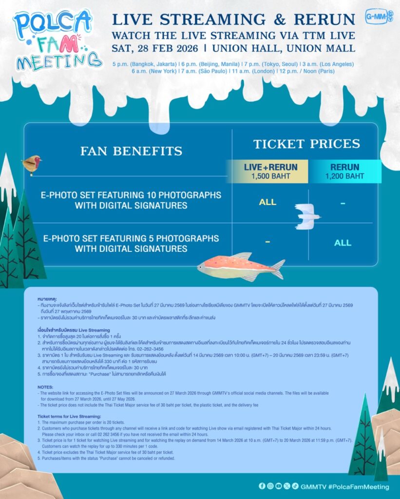 สำหรับผู้สนใจสามารถจับจองบัตรงาน “POLCA FAM MEETING” บนช่องทางออนไลน์ ในวันเสาร์ที่ 10 มกราคม 2569 เริ่มเวลา 10.00 น. เป็นต้นไป เปิดจำหน่ายทุกที่นั่ง ทางออนไลน์ที่ www.thaiticketmajor.com เท่านั้น และ เปิดจำหน่ายบัตร ทุกช่องทางตามปกติ ในวันอาทิตย์ที่ 11 มกราคม 2569 เริ่มเวลา 10.00 น. เป็นต้นไป ทางไทยทิคเก็ตเมเจอร์ทุกสาขา, www.thaiticketmajor.com และ Call center โทร 0-2262-3456 โดยบัตรราคา 6,000 / 5,000 / 4,500 / 4,000 /  3,500 / 3,000 / 2,500 / 2,000 / 1,500 บาท และดูสดผ่าน TTM LIVE บัตรราคา 1,500 / 1,200 บาท (ลิ้งค์และโค้ดรับชม) (กรณีต้องการรับบัตรพลาสติกที่ระลึก ชำระเพิ่ม 30/ใบ) หรือติดตามรายละเอียดเพิ่มเติมได้ที่ www.thaiticketmajor.com หรือ www.facebook.com/gmmtvofficial & Instagram & X & TikTok & YouTube & Weibo : GMMTV