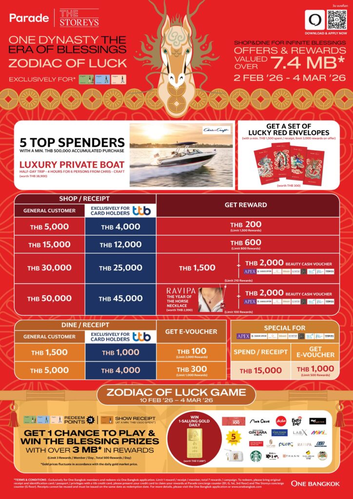 วัน แบงค็อก รีเทล (One Bangkok Retail) รีเทลแลนด์มาร์กแห่งไลฟ์สไตล์อันครบครันใจกลางกรุงเทพฯ พร้อมมอบ “Rhythmic Experience” ประสบการณ์ใหม่ที่เต็มไปด้วยท่วงทำนองแห่งความสุข ผสมผสานจังหวะการช้อปปิ้งและไลฟ์สไตล์ให้มีสีสันกว่าที่เคย ด้วยการเฉลิมฉลองเทศกาลตรุษจีนอย่างยิ่งใหญ่ในงาน One Dynasty: The Era of Blessing พร้อมจับมือบัตรเครดิต ttb ส่งแคมเปญ “ZODIAC OF LUCK” มอบความคุ้มค่าต้อนรับปี มอบสิทธิพิเศษให้สมาชิก One Bangkok รับของรางวัลรวมมูลค่าสูงสุด 7.4 ล้านบาท พร้อมออนท็อปเอกสิทธิ์เหนือระดับสำหรับผู้ใช้จ่ายผ่านบัตรเครดิต ttb ครบตามเงื่อนไขตั้งแต่วันนี้ถึงวันที่ 4 มีนาคม 2569
