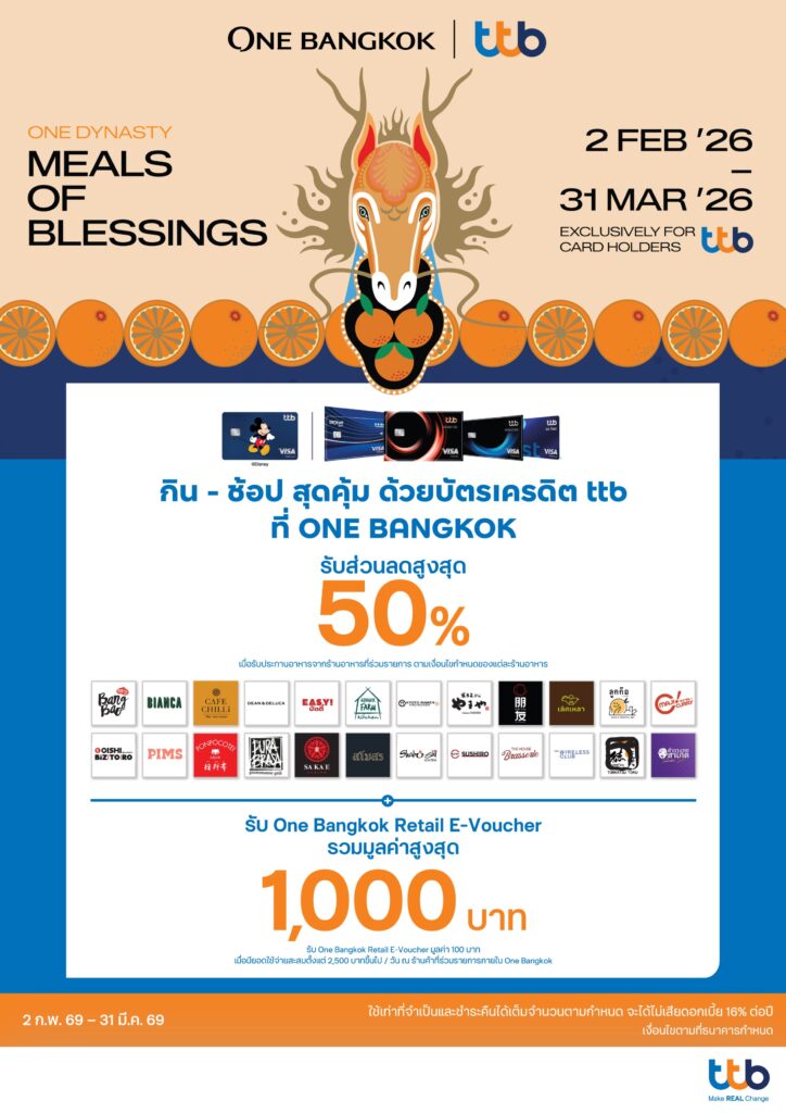 - กิน – ช้อป สุดคุ้ม ที่ One Bangkok กับบัตรเครดิต ttb รับส่วนลดสูงสุด 50% จากร้านอาหารที่ร่วมรายการ และแลกรับ One Bangkok Retail e-Voucher รวมมูลค่าสูงสุด 1,000 บาท ตั้งแต่วันนี้ถึงวันที่ 31 มีนาคม 2569