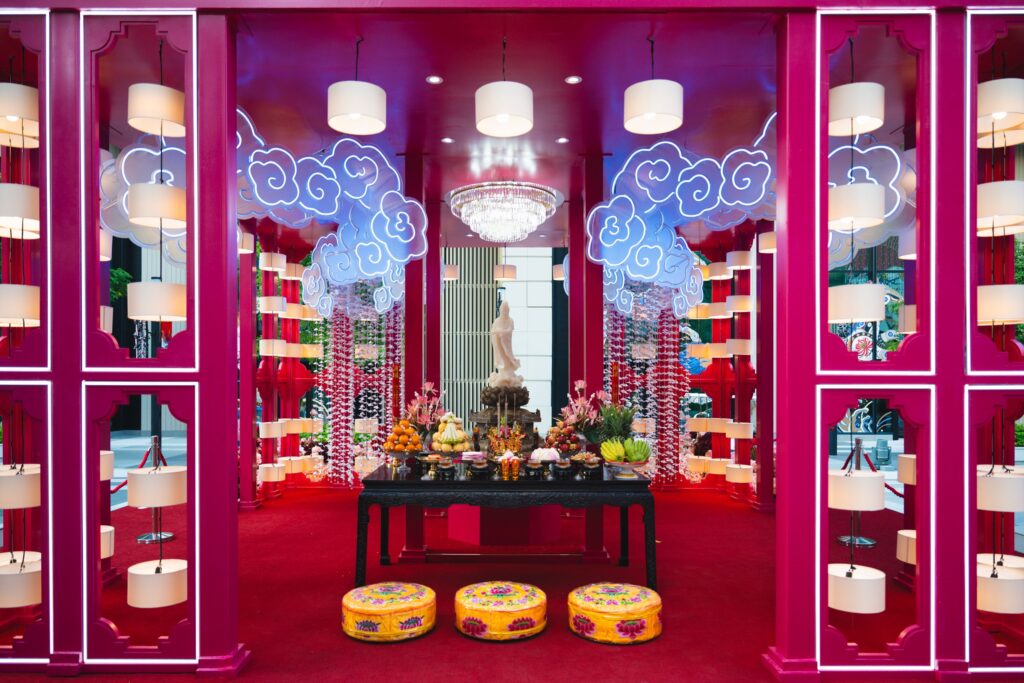 - ศาลาแห่งพรอันสูงสุด (Blessing Pavilion of Guanyin Bodhisattva) ที่ One Bangkok Park – ที่ประทับของพระอวโลกิเตศวรโพธิสัตว์ (กวนอิมโพธิสัตว์)ซึ่งแกะสลักจากหยกขาว ถือแจกันน้ำมนต์ สัญลักษณ์แห่งกรุณา ปัญญา ความมั่งคั่ง และโชคลาภ จากนั้นก้าวผ่าน “สะพานแห่งความโชคดี” (The Bridge of Fortune) สัญลักษณ์แห่งการเชื่อมโยงระหว่างฟ้ากับดิน จากความฝันสู่ความจริง สื่อถึงความหวังและโอกาส และต่อเนื่องไปที่ The Lighthouse ในรูปทรงแจกันดอกทิวลิปสไตล์เดลฟต์ (Delft Tulip Vase) ประดับด้วย ดอกทิวลิปสีเหลือง สัญลักษณ์ของความสุขและความมั่งคั่ง