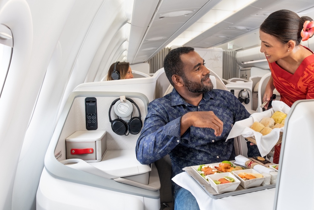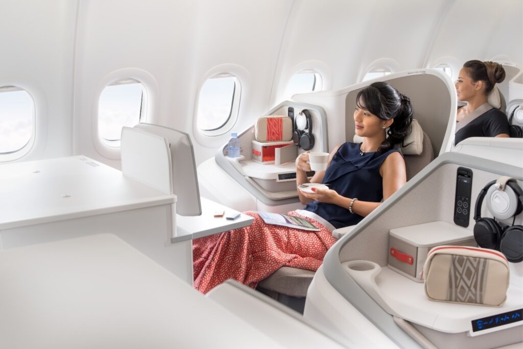 - ชั้นธุรกิจ (Business Hibiscus Class): ห้องโดยสารดีไซน์โมเดิร์น พร้อมที่นั่งแบบ fully-flat bed ทุกที่นั่งและทางเดินเข้า–ออกแบบตรง ให้ความเป็นส่วนตัวสูง เหมาะสำหรับนักธุรกิจและนักเดินทางที่ต้องการพักผ่อนเต็มที่ก่อนถึงปารีสหรือกลับกรุงเทพฯ มาพร้อมจอ LED HD ขนาดใหญ่ ระบบความบันเทิงครบ และสิทธิใช้เลานจ์สนามบินทั้งที่นูเมอา กรุงเทพฯ และปารีส