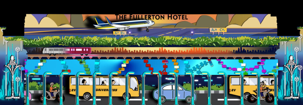 “Future Takes Flight” โดย Koh Jun Kai คือผลงานชิ้นสุดท้ายของชุดผลงานที่ได้รับให้สร้างสรรค์ขึ้นเป็นพิเศษถ่ายทอดภาพอนาคตอันลงตัว ที่ซึ่งผู้คน ธรรมชาติ และเทคโนโลยีสามารถอยู่ร่วมกันได้อย่างสมดุล ผ่านการตีความใหม่ที่สดใสและสนุกสนานในสไตล์แบบนามธรรม (Abstract) Jun Kai ได้สร้างภาพเมืองสิงคโปร์แห่งอนาคตที่เต็มไปด้วยนวัตกรรม ความคิดสร้างสรรค์ และจิตวิญญาณร่วมกัน