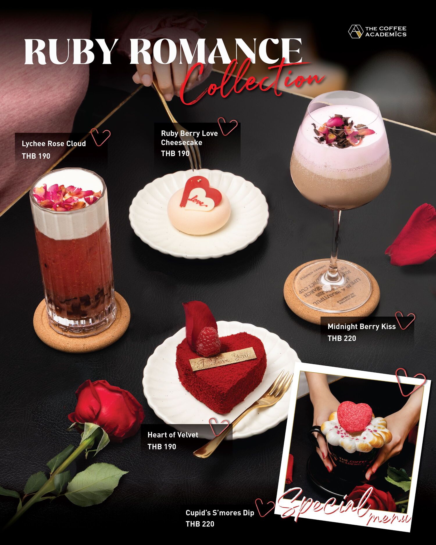 • หวานละมุนสไตล์คอฟฟี่เลิฟเวอร์ กับ “เดอะ คอฟฟี่ อะคาเดมิคส์” (The Coffee Academics) คาเฟ่ระดับโลกชวนเติมความหวานด้วยเมนูเลิฟลี่ซีรีส์ ทั้งเค้ก Heart of Velvet และ Ruby Berry Love Cheesecake (ชิ้นละ 190 บาท) จับคู่กับเครื่องดื่มสีหวานอย่าง Midnight Berry Kiss (220 บาท) พร้อมให้บริการที่สาขาเกษรวิลเลจ, โครงการเวลาหลังสวน, เซ็นทรัลเวิลด์ และคิงสแควร์