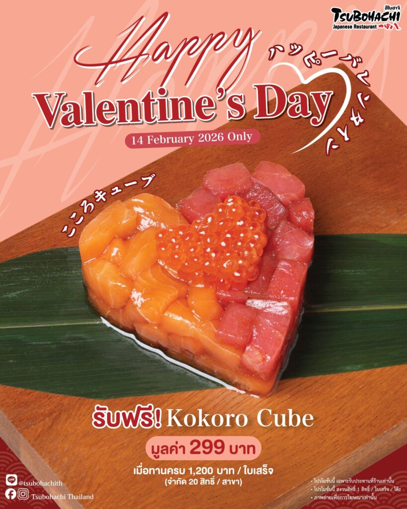 • บอกรักผ่านรสชาติสไตล์ฮอกไกโด กับ “สึโบฮาจิ” (Tsubohachi) พิเศษเฉพาะวันที่ 14 ก.พ. นี้เท่านั้น! รับฟรีเมนู “Kokoro Cube” (มูลค่า 299 บาท) ปลาแซลมอนและมากูโร่สดใหม่ปรุงรสสไตล์ยุเกะ ท็อปด้วยไข่ปลาแซลมอนรูปหัวใจ เมื่อรับประทานอาหารครบ 1,200 บาทขึ้นไปต่อใบเสร็จ (จำกัด 20 สิทธิ์/สาขา/วัน) พบกันได้ที่สึโบฮาจิทุกสาขา (ยกเว้นสาขาเดอะ พอร์ทอล)