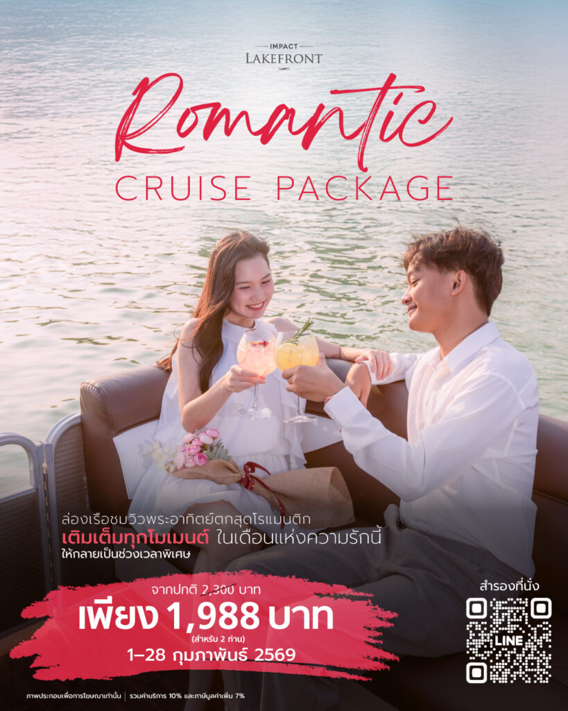 • โรแมนติกเหนือระดับกลางทะเลสาบ กับ “อิมแพ็ค เลคฟร้อนท์” (IMPACT Lakefront) ยกระดับความหวานด้วยแพ็กเกจ “Romantic Cruise Package 2026” ในราคาเพียง 1,988 บาท (สำหรับ 2 ท่าน) สัมผัสประสบการณ์ล่องเรือชมพระอาทิตย์ตกดิน ณ ทะเลสาบเมืองทองธานี พร้อมจิบเครื่องดื่มพิเศษ และรับฟรีบัตรกำนัลอาหารมูลค่า 1,200 บาท สำหรับใช้บริการต่อเนื่องที่ร้าน (บัตรกำนัลใช้ได้ถึง 31 มี.ค. 69) สำรองที่นั่งล่วงหน้าอย่างน้อย 1 วัน