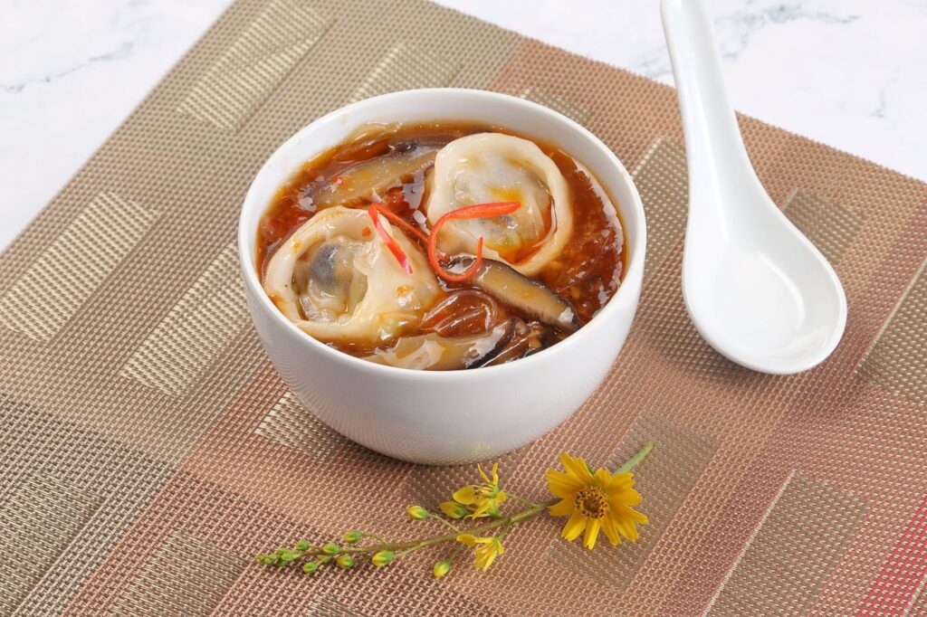 • ซุปเกี้ยวน้ำเสฉวนเจ — เกี้ยวผักแน่นไส้ในน้ำซุปเปรี้ยวเผ็ดสไตล์เสฉวน สูตรเฉพาะของร้าน