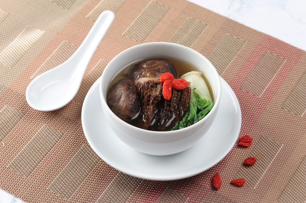 • ซุปเห็ดมอเรลเห็ดหอมเก๋ากี้ผักฉ่อยเจ — ซุปใสหอมหวานจากเห็ดมอเรล เห็ดหอม เก๋ากี้ และผักฉ่อย อุดมคุณค่าบำรุงสุขภาพ