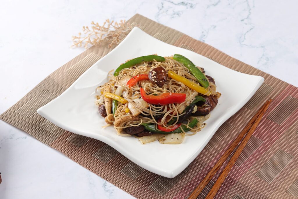 • หมี่ซั่วผัดเห็ดรวมซอสเห็ดทรัฟเฟิลเจ — เส้นหมี่ซั่วผัดกับเห็ดนานาชนิด ปรุงด้วยซอสทรัฟเฟิลหอมกรุ่นสไตล์ฟิวชัน