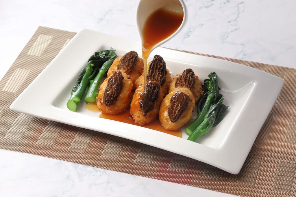 • เต้าหู้เทวดาเห็ดมอเรลน้ำมันหอยเจ — เต้าหู้เนื้อนุ่มทอดกรอบ เสิร์ฟพร้อมเห็ดมอเรลและซอสน้ำมันหอยเจสูตรเข้มข้น