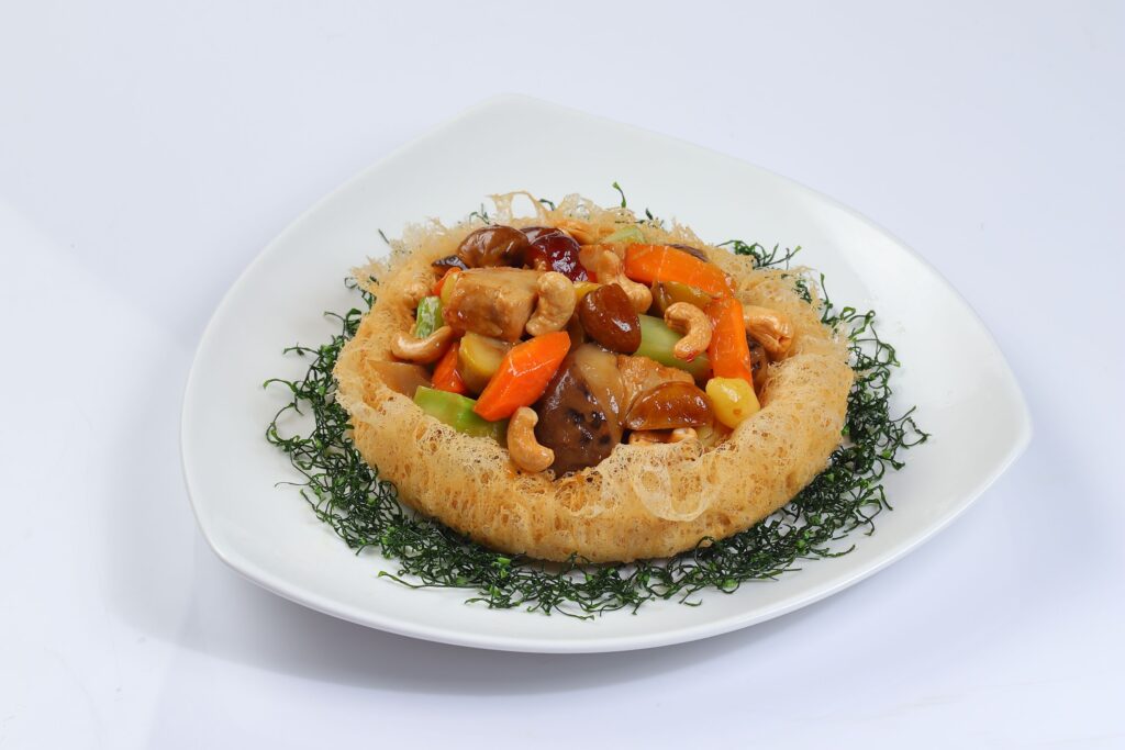 • เผือกทอดวงแหวนผัดโหงวก๊วยไก่เจ — เผือกทอดเป็นวงแหวน เสิร์ฟพร้อมไก่เจผัดธัญพืช 5 ชนิด หอมมันลงตัว