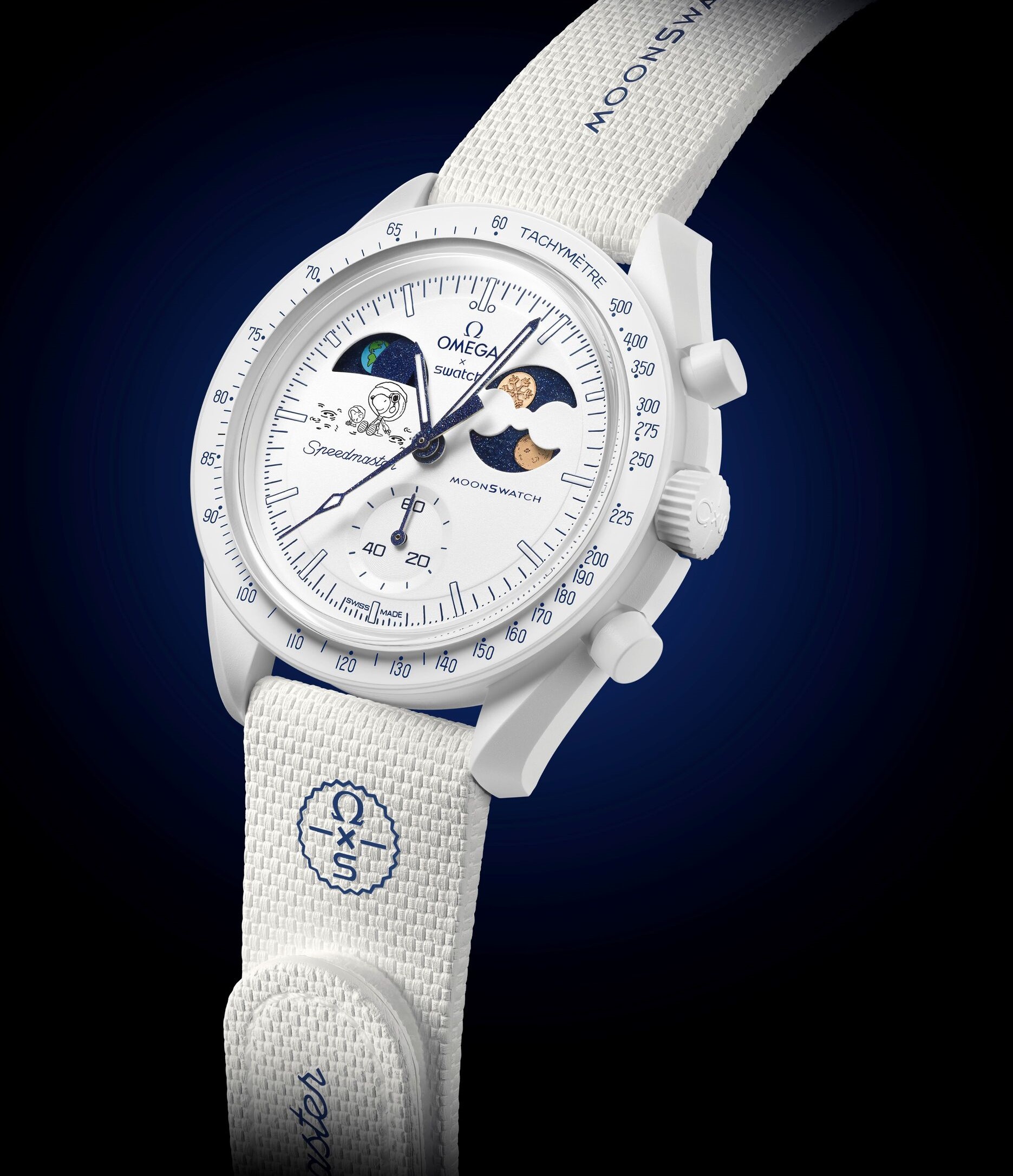 โลโก้ OMEGA X Swatch ถูกจัดวางอย่างโดดเด่นบนหน้าปัดและเม็ดมะยม พร้อมสลักข้อความพันธกิจบนฝาหลัง ส่วนฝาครอบแบตเตอรี่ตกแต่งด้วยดีไซน์จากผืนโลก และสายนาฬิกายาง VELCRO® สีขาวก็แฝงตัวยความเท่แบบฉบับนักบินอวกาศ