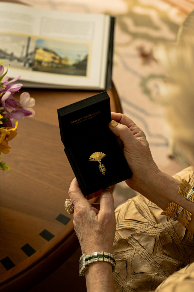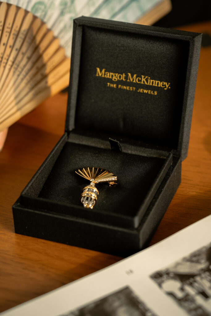 มาโกต์ แม็คคินนีย์ (Margot McKinney) ได้รับเชิญร่วมสร้างสรรค์คอลเลกชันเฉลิมฉลองเพื่อเป็นสัญลักษณ์ในวาระครบรอบ 150 ปีของ โรงแรมแมนดาริน โอเรียนเต็ล กรุงเทพฯ  ด้วยแรงบันดาลใจที่ได้จากความผูกพันส่วนตัวอันยาวนานที่มีต่อโรงแรมแห่งนี้แม็คคินนีย์ ได้ถ่ายทอดความทรงจำแห่งล็อบบี้อันเป็นเอกลักษณ์ พร้อมโคมไฟระย้าที่งามดุจโคมประทีป ให้กลายเป็นผลงานศิลป์สวมใส่เข้าคู่กับลายพัดซิกเนเจอร์ของแบรนด์แมนดาริน โอเรียนเต็ล การออกแบบที่ได้แรงบันดาลใจจากโคมไฟ กลายเป็นคอลเลกชันเข็มกลัดและต่างหูที่รังสรรค์ขึ้นมาเป็นพิเศษเพื่อโอกาสสำคัญในปีนี้