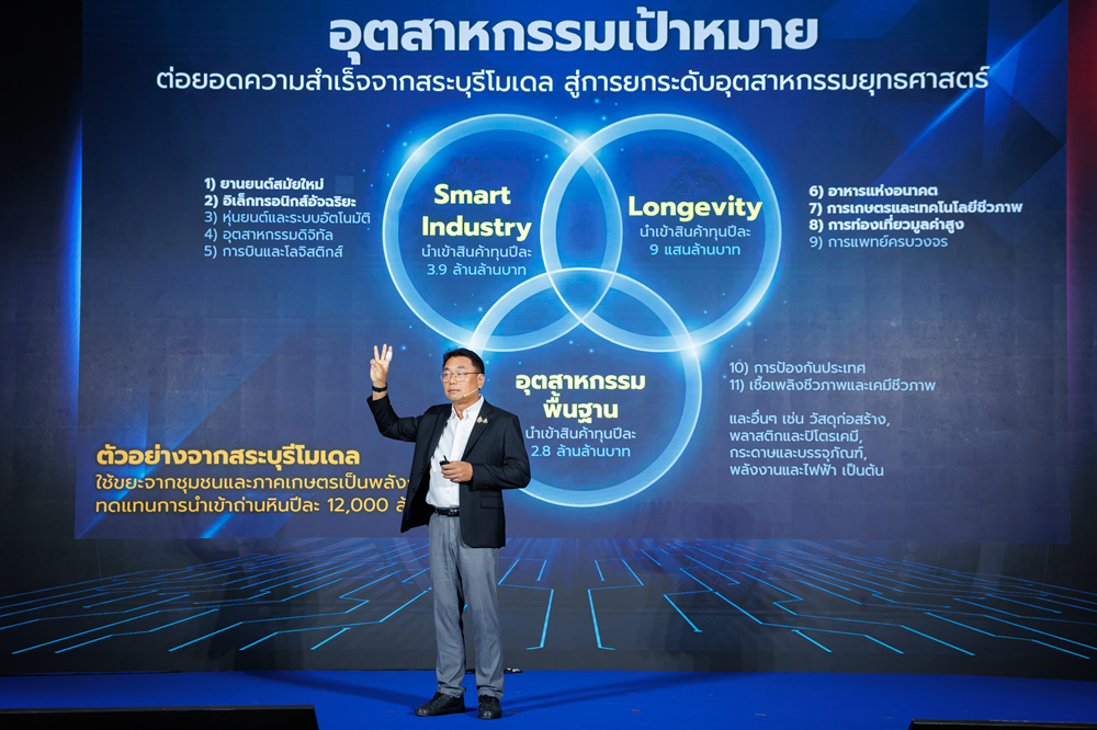 ทั้งนี้ ยุทธศาสตร์ขับเคลื่อนอุตสาหกรรมไทยก้าวกระโดดสู่ SMART INDUSTRY คือ 5 SMART + ร่วมลงมือทำ 1. Smart Industry: เพิ่มประสิทธิภาพการผลิต 2 เท่า 2. Smart Market: สร้างตลาดในประเทศ และขยายตลาดต่างประเทศ 3. Smart Funding: สนับสนุนเงินทุน SMEs เพื่อการเปลี่ยนผ่าน 4. Smart & Green Infrastructure: ส่งเสริมลดต้นทุนพลังงานและโลจิสติกส์ 5. Smart Government: ผลักดันราชการเร็ว สะดวก โปร่งใส พลัสด้วย PPPP Model (Public Private People Partnership) ความร่วมมือภาครัฐ เอกชน และประชาสังคมร่วมทำบนจุดแข็งของตัวเอง ยกระดับ “สระบุรีโมเดล” ที่ประสบความสำเร็จ เป็น Thailand Model เพื่อขยายผลวิธีการทำงานด้วยความร่วมมือ โดยภาครัฐมีแนวทาง เอกชนขับเคลื่อน และประชาชนได้ประโยชน์