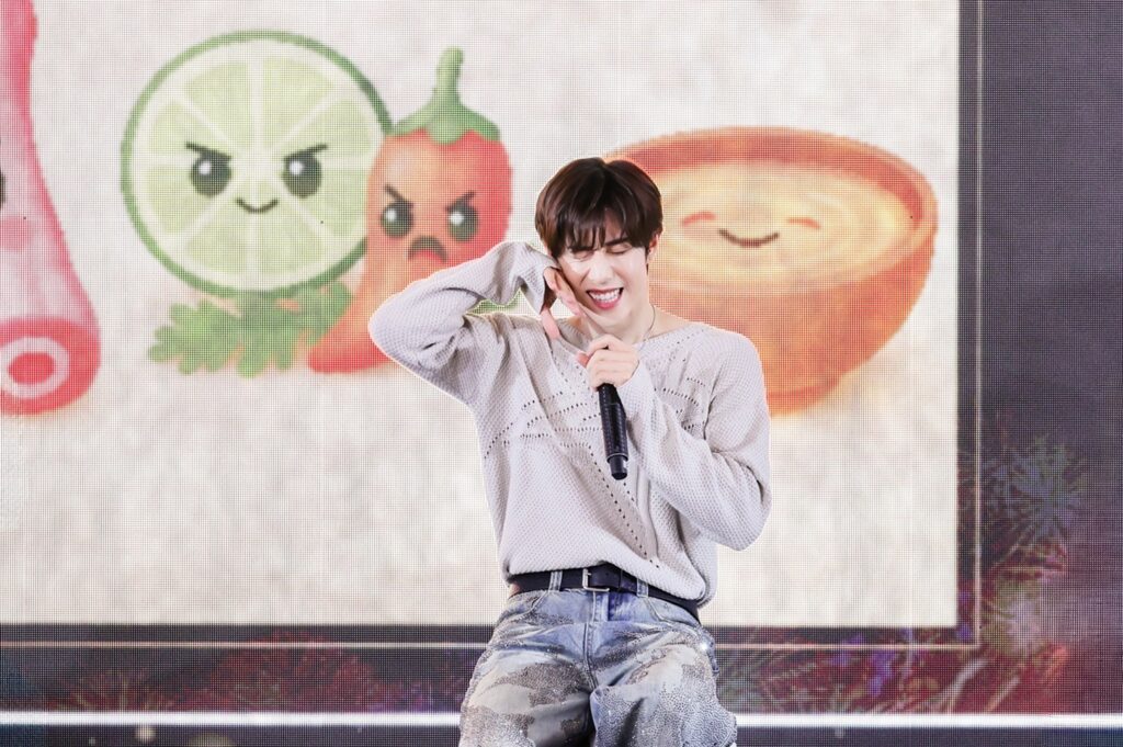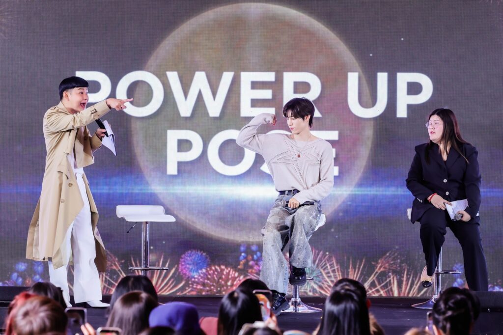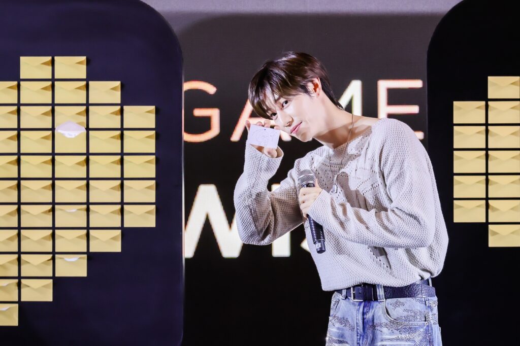 บรรยากาศภายในงานเริ่มต้นด้วยความคึกคักและรอยยิ้ม เมื่อเหล่าอากาเซ่พร้อมใจกันเขียนข้อความอวยพรปีใหม่ส่งต่อพลังบวกให้ศิลปินคนโปรด ก่อนที่ “มาร์ค ต้วน” จะปรากฏตัวด้วยออร่าสุดปังเรียกเสียงกรี๊ดสนั่น พร้อมรอยยิ้มกระชากใจที่ทำเอาแฟนๆ ละลายกันถ้วนหน้า เริ่มต้นความสนุกแรกกับเกม Moment of Taste ที่มาร์คต้องโชว์สกิลใบ้คำเมนูอาหารไทยสุดโปรดอย่าง “ข้าวซอยไก่, เล้งแซ่บ และข้าวเหนียวมะม่วง” จนเรียกเสียงหัวเราะได้ลั่นงาน ต่อด้วยความขี้เล่นในเกม New Year Gift Roulette ที่เจ้าตัวต้องหมุนวงล้อทำท่าทางสุดคิวท์ตามโจทย์แบบจัดเต็มไม่มีกั๊ก ก่อนจะเข้าสู่โหมดอบอุ่นในเกม Fan Wish Pick ที่มาร์คบรรจงเลือกข้อความอวยพรจากแฟนๆ ขึ้นมาอ่านด้วยตัวเอง สร้างความประทับใจไปตามๆ กัน