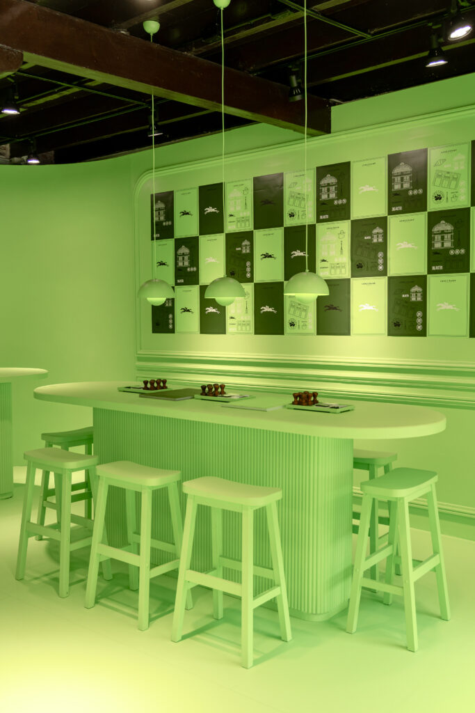 ทันทีที่ก้าวเข้าสู่ป็อปอัป จะได้พบกับโลกสีเขียวตั้งแต่พื้นจรดเพดาน ซึ่งไม่ใช่เพียงสีประจำแบรนด์เท่านั้น แต่ยังเป็นสัญลักษณ์ของความหวังและตัวตนที่ลองฌองป์ยึดถือมาตลอดหลายทศวรรษ โดยสีเขียวเข้ม (Heritage Green) ให้ความรู้สึกสง่างามเหนือกาลเวลาและความเป็นธรรมชาติ ส่วนสีเขียวอ่อน (Light Green) สะท้อนการถ่ายทอดคิดสร้างสรรค์และความกล้าที่จะค้นหาสิ่งใหม่ ๆ โดยทุกมุมมีการดีไซน์ให้มีลูกเล่นชวนสำรวจ เชื่อมโยงกับมรดกและจิตวิญญาณของ แบรนด์อย่างลงตัว
