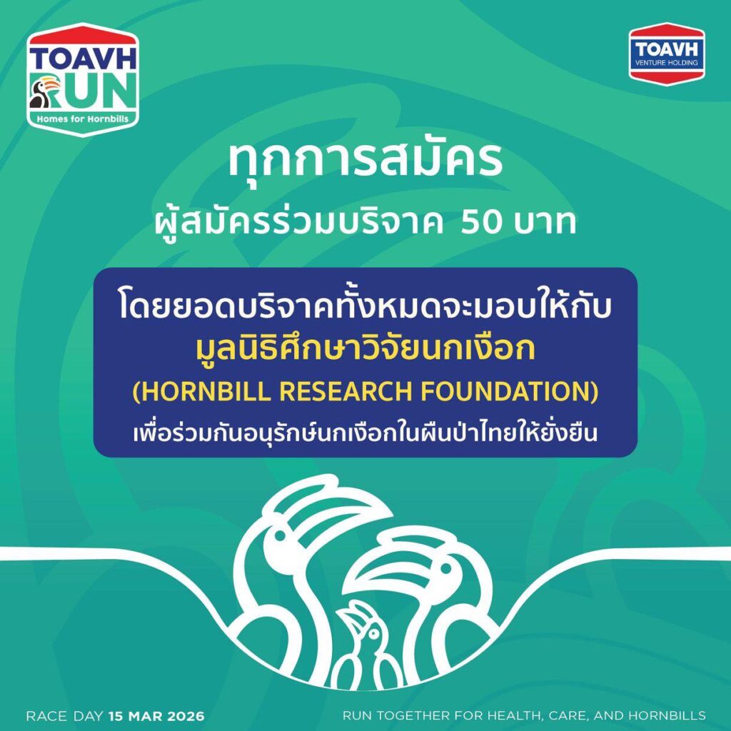 TOAVH ขอเชิญชวนประชาชน นักวิ่ง และผู้รักธรรมชาติทุกท่าน ร่วมเป็นส่วนหนึ่งในการอนุรักษ์นกเงือก และฟื้นฟูฝืนป่าไทย ด้วยการสมัครเข้าร่วมกิจกรรมวิ่งการกุศล “TOAVH RUN X Homes for Hornbills” ในวันอาทิตย์ที่ 15 มีนาคม 2569 ณ สวนหลวง ร.9 – บึงหนองบอน ผ่านช่องทางออนไลน์ https://race.thai.run/toavhrun2026 เปิดรับสมัครแล้วตั้งแต่วันนี้เป็นต้นไป