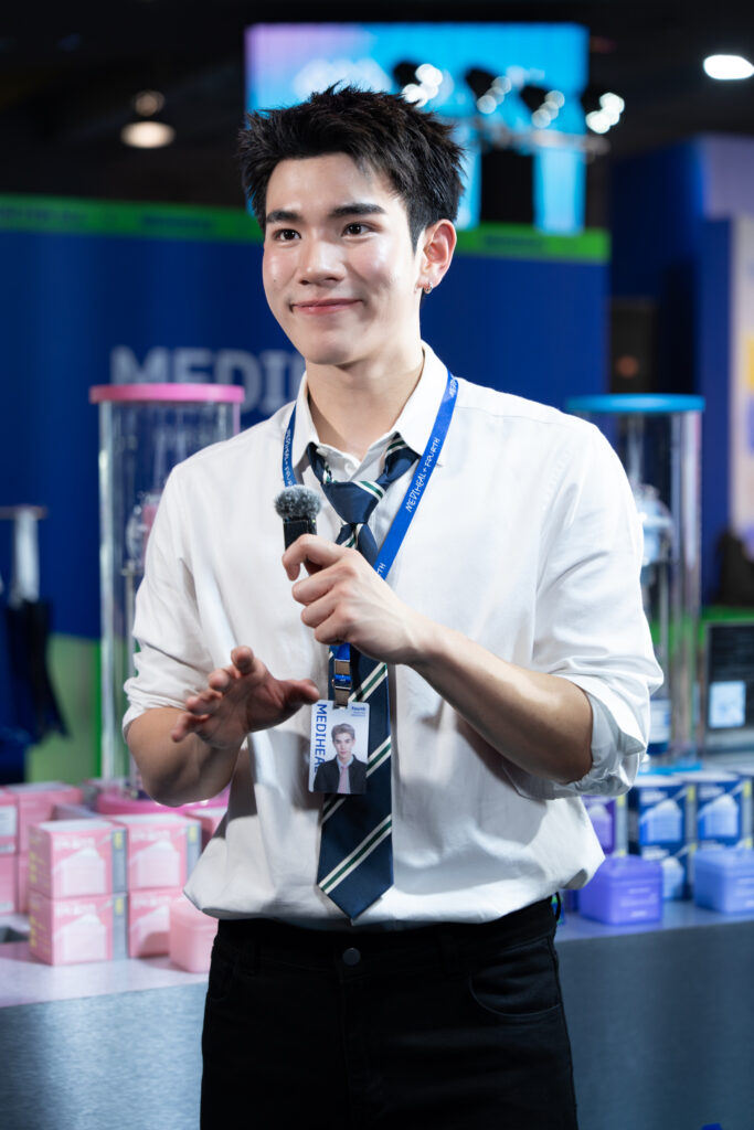 บรรยากาศภายในงาน ‘Pop-up: MEDIHEAL DERMA SHOP’ จัดเต็มท่ามกลางสื่อมวลชน ชาวสยามแฟนคลับล้นทะลัก เพราะ MEDIHEAL ขนไอเทมดูแลผิวตัวท็อปมาแบบครบเซต โดยเฉพาะ Toner Pad โทนเนอร์แพดอันดับ 1 จากเกาหลีใต้ที่หลายคนยกให้เป็นจุดเริ่มต้นของผิวดี ช่วยดูแลได้ครอบคลุมหลายปัญหาผิว และเข้าสู่ช่วงไฮไลต์เมื่อ ‘โฟร์ท ณัฐวรรธน์’ แบรนด์แอมบาสเดอร์ MEDIHEAL Toner Pad ปรากฏตัวบนเวทีด้วยลุคหนุ่มออฟฟิตที่จริงใจออร่าจับ งานผิวสุขภาพดี จนเห็นแล้วเชื่อเลยว่าผิวดีมีอยู่จริง แถมยังขึ้นมาแชร์เคล็ดลับ ‘เดอร์มาโซลูชันเพื่อผิวสุขภาพดี’ แบบไม่มีกั๊กอีกด้วย และยิ่งทำให้แฟน ๆ ใจละลายกว่าเดิมเพราะกิจกรรมพิเศษสุดเอ็กซ์คลูซีฟที่ได้ใกล้ชิด ‘โฟร์ท’ ทั้งเล่นเกมและถ่ายภาพร่วมกับผู้โชคดีบนเวที เรียกเสียงกรี๊ด ดังสนั่นตลอดกิจกรรมเติมความพีกความฟินให้บรรยากาศในงานยิ่งขึ้นไปอีกขั้น