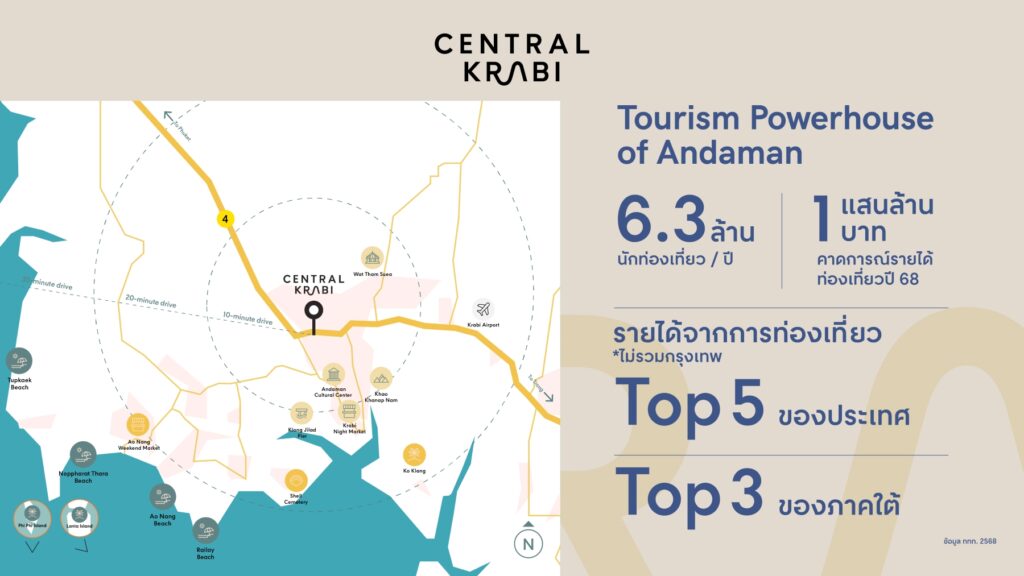 ดร.ณัฐกิตติ์ ตั้งพูลสินธนา กรรมการผู้จัดการใหญ่ สายงานการตลาด บมจ. เซ็นทรัลพัฒนา กล่าวว่า “กระบี่เป็นหนึ่งในจังหวัดศักยภาพสูงของภาคใต้ เป็น Tourism Powerhouse of Andaman ที่มีรายได้จากการท่องเที่ยวปี 2567 กว่า 91,000 ล้านบาท ติด Top 5 ของประเทศ (ไม่รวมกรุงเทพฯ) และคาดว่าในปี 2568 รายได้จากการท่องเที่ยวจะเพิ่มขึ้นราว1 แสนล้านบาท จากนักท่องเที่ยวกว่า 6.3 ล้านคน/ปี โครงสร้างพื้นฐานและระบบขนส่งของจังหวัดกำลังพัฒนาอย่างก้าวกระโดด พร้อมด้วยโครงการท่าเรือวงแหวนอันดามัน ที่เชื่อมกระบี่-ภูเก็ต-พังงา เป็น Triangle of Andaman รองรับเรือเฟอร์รีความเร็วสูง สร้าง Seamless Connectivity ครบทั้งทางบก ทางอากาศ และทางทะเล ด้วยศักยภาพของกระบี่ทั้งทรัพยากรธรรมชาติ อากาศดี และคุณภาพชีวิตที่มี Work-Life Balance ลงตัว ด้วยโครงการพัฒนาโครงสร้างพื้นฐานสำคัญ เซ็นทรัล กระบี่ จึงได้ร่วมผลักดันจังหวัดให้ก้าวสู่การเป็น Digital Nomad Hub ของประเทศอย่างเต็มศักยภาพ”