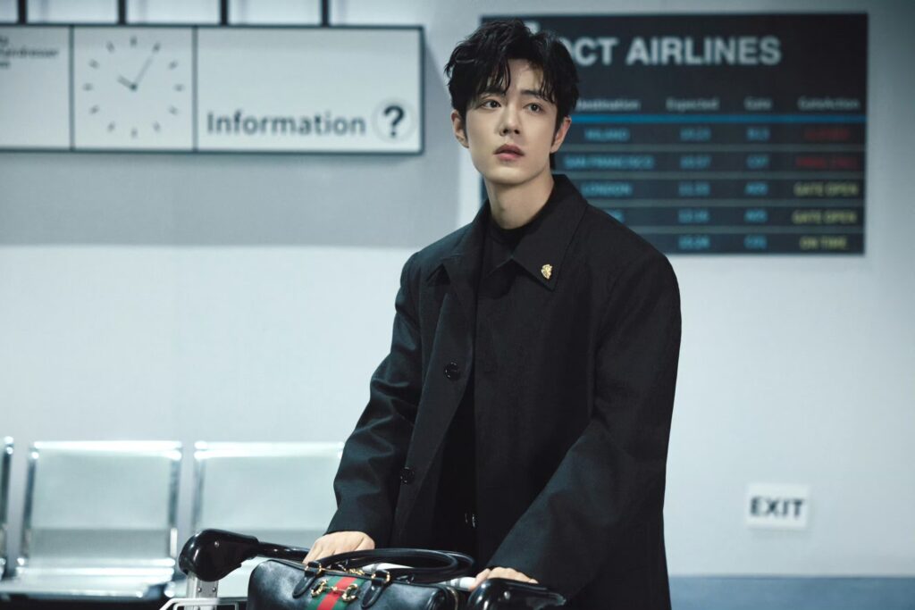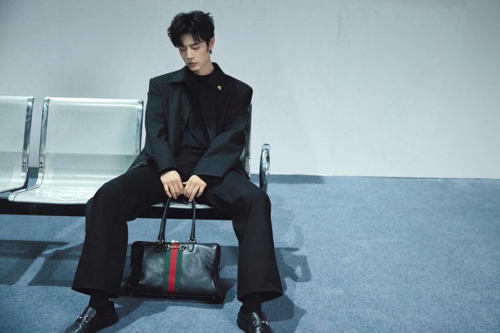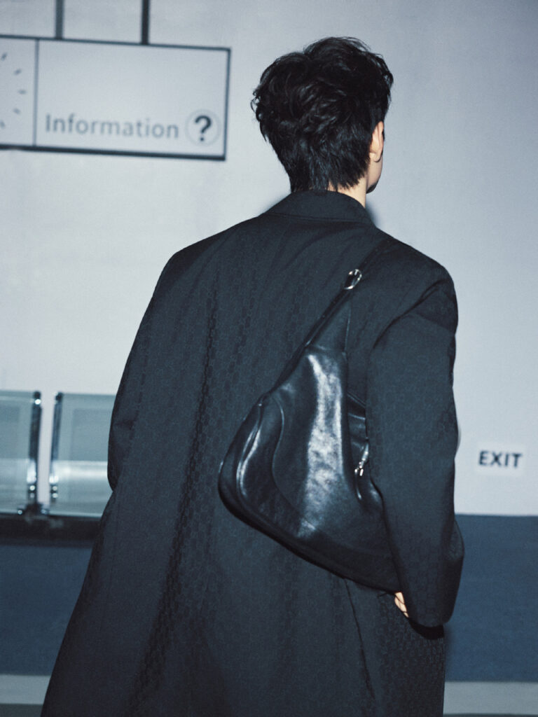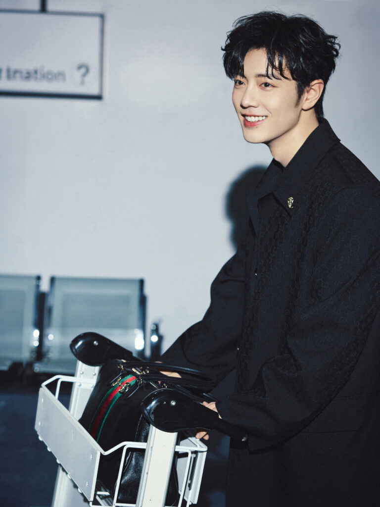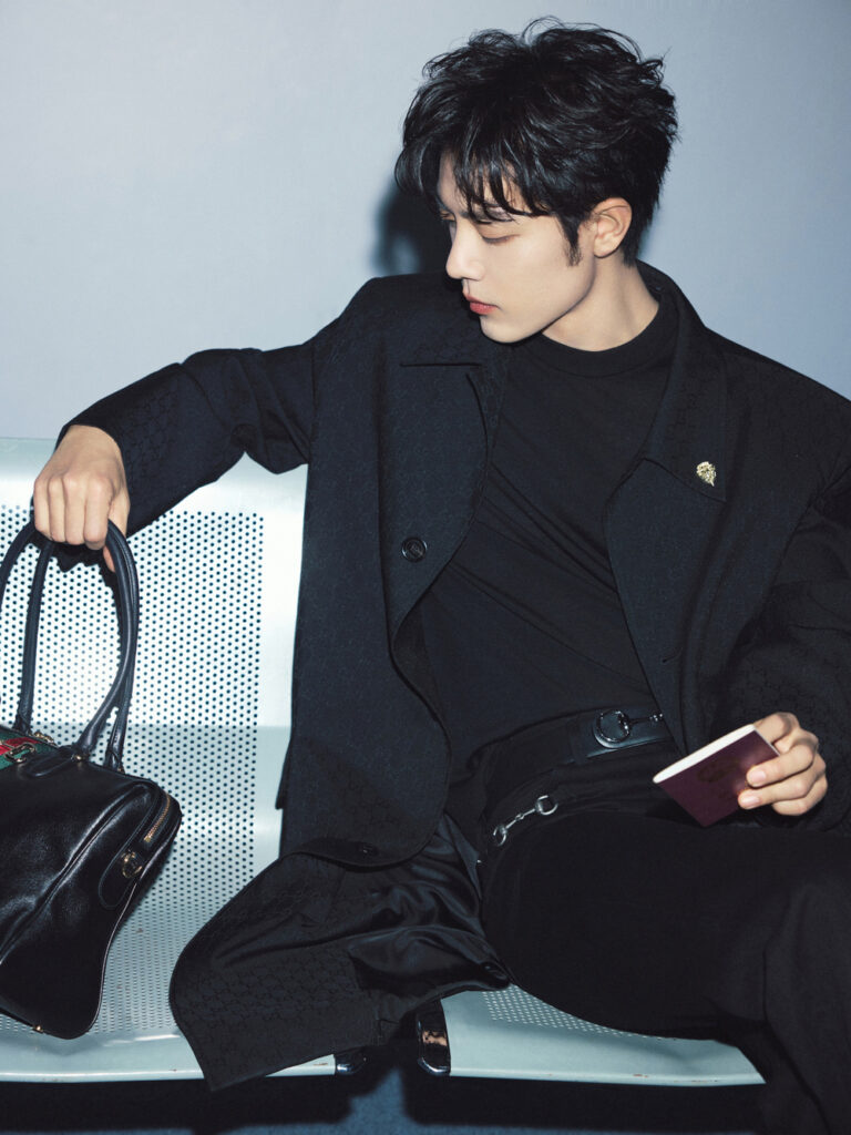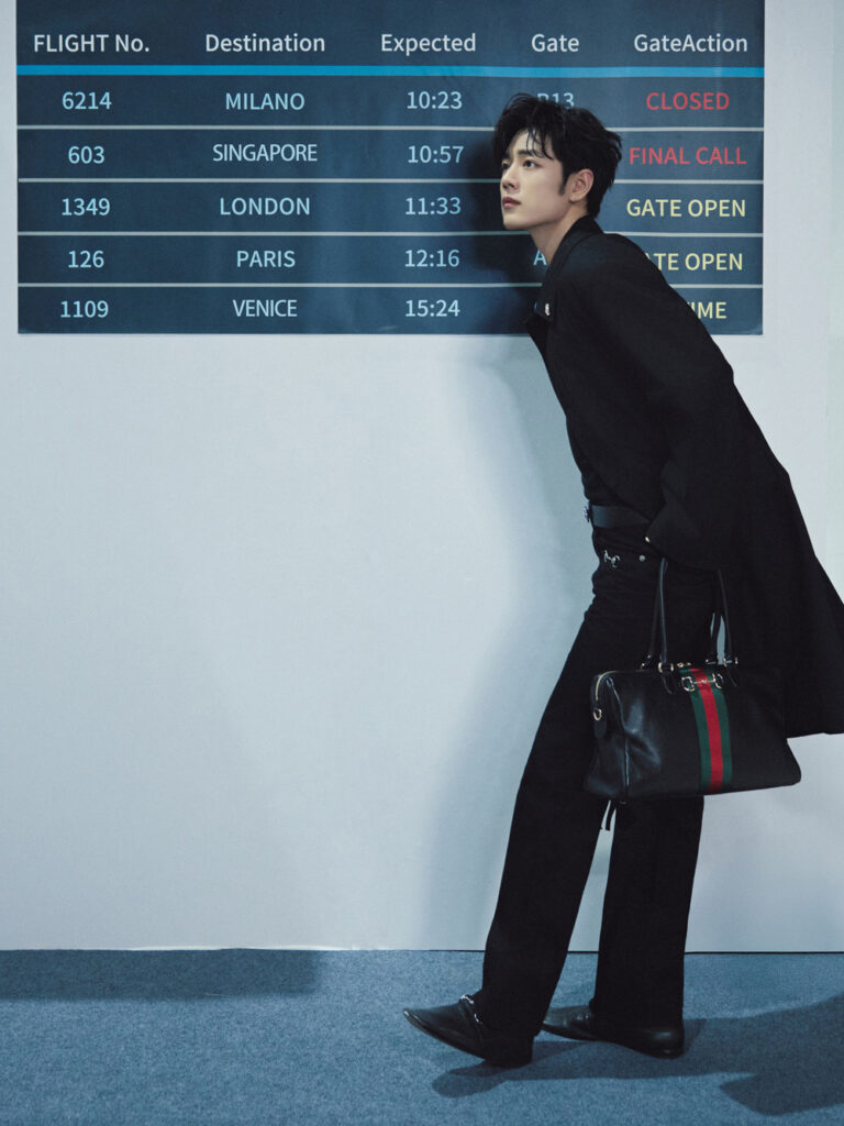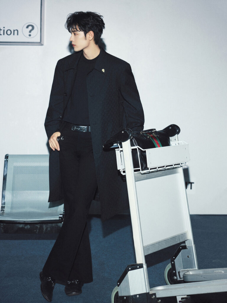 สำหรับแอร์พอร์ตลุคในครั้งนี้เซียวจ้านมาในโททัลลุคสีดำ สวมใส่โค้ทยาวลายทอแจ็คการ์ด GG สุดคลาสสิค เน้นเส้นสายคมชัด เสริมด้วยเข็มขัด Horsebit และจับคู่กับ Gucci Borsetto กระเป๋าทรงบอสตัน เป็นการแมทช์ลุคที่ผสานความเรียบง่ายสุดคลาสสิคที่เผยความสง่างามให้มีออร่าโดดเด่นยิ่งขึ้น