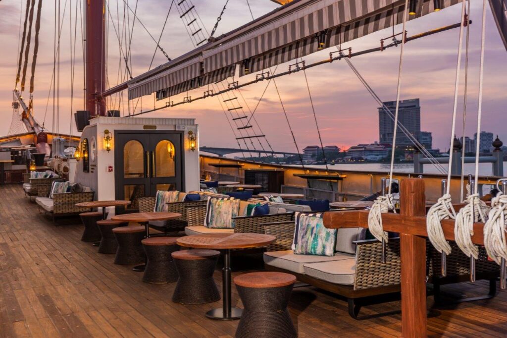 ผู้มาเยือนสามารถเลือกดื่มด่ำประสบการณ์บน Upper Deck พื้นที่เอาต์ดอร์สุดหรูที่มองเห็นวิวแม่น้ำเจ้าพระยาอันงดงาม หรือ Lower Deck พื้นที่ภายในที่อบอวลด้วยกลิ่นอายประวัติศาสตร์ ตกแต่งด้วยเฟอร์นิเจอร์และภาพถ่ายกรุงสยามในอดีต สำหรับโอกาสพิเศษ The Bridge ห้องส่วนตัวสำหรับไม่เกิน 6 ท่าน พร้อมบาร์ลับ มอบบรรยากาศเป็นส่วนตัวและน่าประทับใจ เหมาะสำหรับการเฉลิมฉลองหรือดินเนอร์สุดโรแมนติก