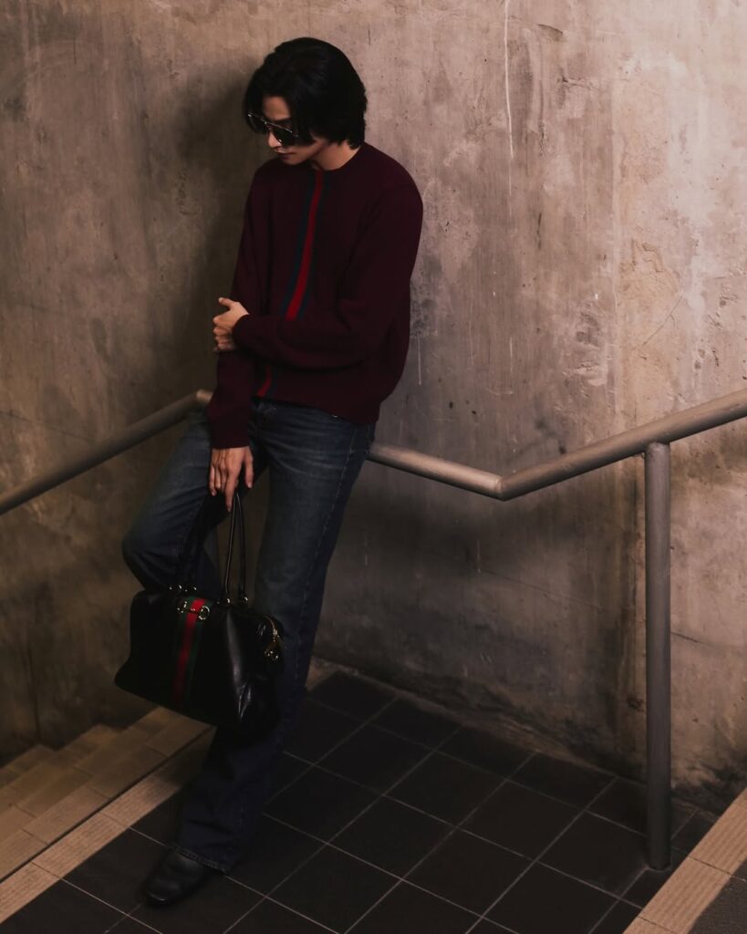 “กลัฟ–คณาวุฒิ” ปรากฏตัวด้วยลุคหล่อแกลม ในเสื้อสเวตเตอร์สีแดงบอร์โดผ้าวูลถักละเอียด ตกแต่งด้วยอินทาร์เซียแถบ Web สีเขียวและสีแดง จับคู่กับกางเกงผ้าฝ้ายเดนิมฟอกสีตกแต่งด้วยสัญลักษณ์ Horsebit จาก คอลเล็คชั่น Spring Summer 2026 เสริมลุคด้วยไอเท็มชิ้นเด่นกระเป๋ารุ่น Borsetto หนังนิ่มสีดำ โดดเด่นด้วยฮาร์ดแวร์รูปทรงตะขอปากม้าซึ่งเป็นรหัสสำคัญของแบรนด์ นำเสนอในซิลูเอตผ่อนคลายร่วมสมัย ปิดท้ายลุคด้วยรองเท้า Horsebit Loafer หนังสีดำ ดีไซน์โครงสร้างประณีตมอบความนุ่มสบายและยืดหยุ่นเป็นพิเศษ พร้อมแว่นกันแดดรูปทรง Aviator ถ่ายทอดเสน่ห์สมมง Brand Ambassador ตัวแทนหนึ่งเดียวจากประเทศไทยของ Gucci ได้อย่างสง่างาม