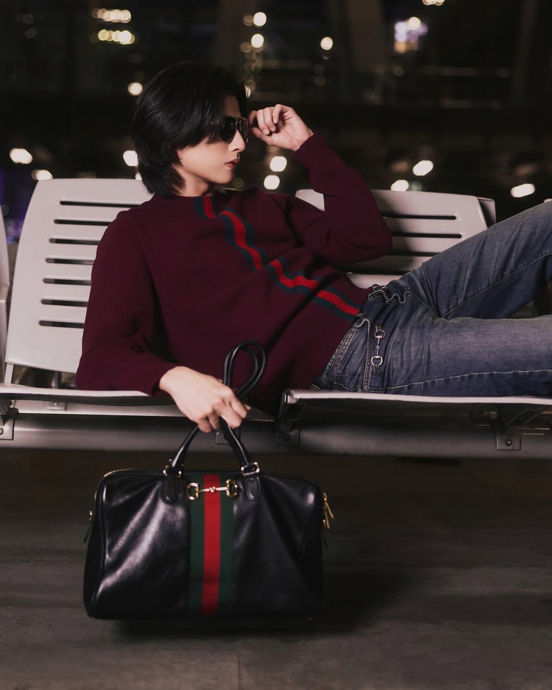 “กลัฟ–คณาวุฒิ” ปรากฏตัวด้วยลุคหล่อแกลม ในเสื้อสเวตเตอร์สีแดงบอร์โดผ้าวูลถักละเอียด ตกแต่งด้วยอินทาร์เซียแถบ Web สีเขียวและสีแดง จับคู่กับกางเกงผ้าฝ้ายเดนิมฟอกสีตกแต่งด้วยสัญลักษณ์ Horsebit จาก คอลเล็คชั่น Spring Summer 2026 เสริมลุคด้วยไอเท็มชิ้นเด่นกระเป๋ารุ่น Borsetto หนังนิ่มสีดำ โดดเด่นด้วยฮาร์ดแวร์รูปทรงตะขอปากม้าซึ่งเป็นรหัสสำคัญของแบรนด์ นำเสนอในซิลูเอตผ่อนคลายร่วมสมัย ปิดท้ายลุคด้วยรองเท้า Horsebit Loafer หนังสีดำ ดีไซน์โครงสร้างประณีตมอบความนุ่มสบายและยืดหยุ่นเป็นพิเศษ พร้อมแว่นกันแดดรูปทรง Aviator ถ่ายทอดเสน่ห์สมมง Brand Ambassador ตัวแทนหนึ่งเดียวจากประเทศไทยของ Gucci ได้อย่างสง่างาม