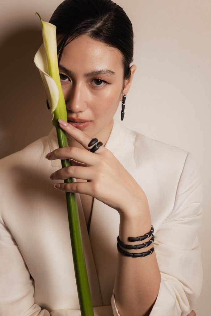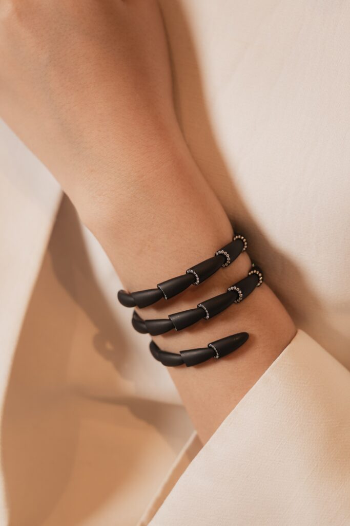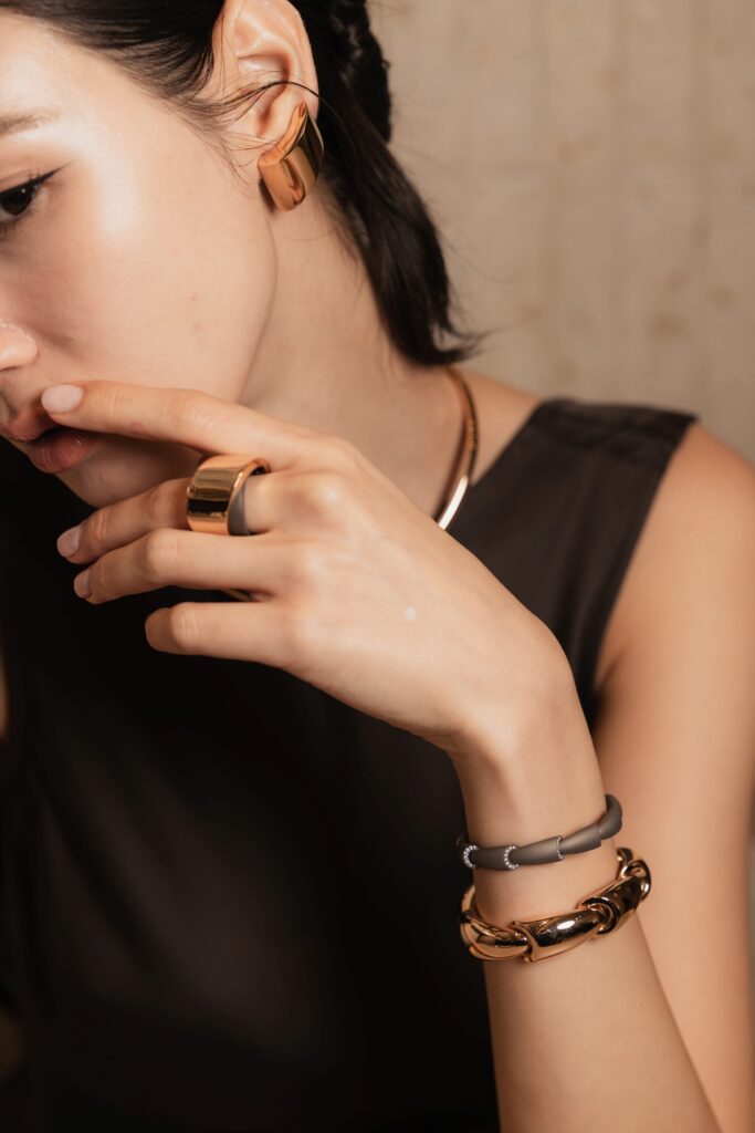 ท่ามกลางเครื่องประดับระดับผลงานวิจิตรศิลป์ที่นำมาจัดแสดงเป็นครั้งแรก พื้นที่อันโดดเด่นสะดุดตาถูกสำรองไว้เพื่อ 2 คอลเลกชันระดับไอคอนที่ยากจะหาใครเทียบ นั่นคือ Abbraccio (อับบราชโช) ภาษาอิตาเลียนหมายถึง ‘อ้อมกอด’ เปรียบเสมือนบทประกาศความงามเชิงประติมากรรมและความสง่างามเหนือกาลเวลา ที่ถ่ายทอดสุนทรีย์แห่งงานประติมากรรมของ VHERNIER ได้อย่างสมบูรณ์แบบ ชิ้นงานถูกจินตนาการและรังสรรค์ขึ้นรูปทรงแบบสายแถบอันบริสุทธิ์ของห่วงทองคำ ที่โอบล้อมผิวกายด้วยสัมผัสอันเย้ายวนและลุ่มลึก เปรียบเสมือนอ้อมกอดที่แนบแน่นราวจุมพิตอ่อนโยนและเปี่ยมด้วยอารมณ์ และ Calla (คาลล่า) คอลเลกชันที่สะท้อนแก่นแท้อันบริสุทธิ์ในการรังสรรค์จิวเวลรีของแบรนด์ ได้รับแรงบันดาลใจจากรูปทรงกรวยอันอ่อนช้อยของดอกลิลลี่ โดดเด่นด้วยเส้นสายที่ทรงพลังโดยถูกลดทอนให้เหลือแก่นแท้ของดีไซน์อย่างมีชั้นเชิง อีกทั้งยังถ่ายทอดจังหวะของรูปทรงที่ต่อเนื่องอย่างมีเสน่ห์ราวเสียงสะท้อนอันชวนหลงใหลไม่รู้จบ