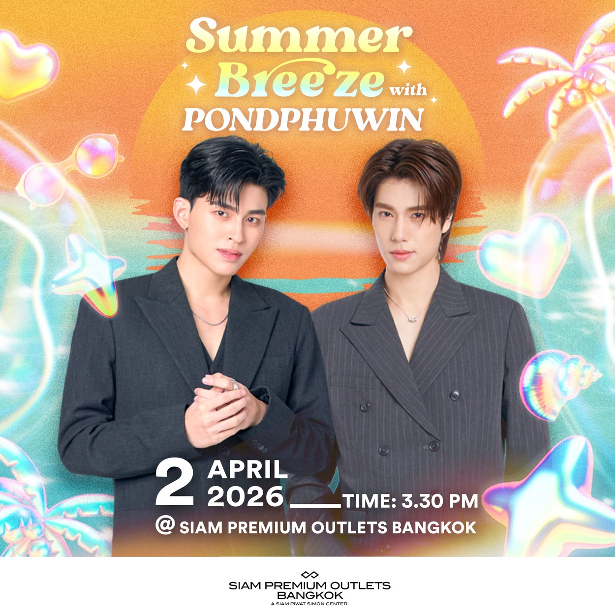 SIAM PREMIUM OUTLETS BANGKOK พรีเมี่ยม เอาท์เล็ต แห่งแรกของเมืองไทยเดสทิเนชั่นในฝันของนักช้อป ที่ขนทัพแบรนด์ลักชัวรี่แบรนด์ระดับเวิลด์คลาส และอินเตอร์เนชั่นแนลแบรนด์ชั้นนำมาสร้างประสบการณ์ช้อปปิ้งที่แตกต่าง พร้อมชวนแฟน ๆ ร่วมสัมผัสบรรยากาศซัมเมอร์สุดฟิน ในงาน “SUMMER BREEZE with PONDPHUWIN” เตรียมพบกับเซอร์ไพรส์พิเศษจากสองนักแสดงสุดฮอต “ปอนด์ ณราวิชญ์” และ “ภูวินทร์ ตั้งศักดิ์ยืน” ที่จะมาสร้างความสุข และมอบโมเมนต์สุดเอ็กซ์คลูซีฟให้กับผู้โชคดีอย่างใกล้ชิด ในวันที่ 2 เมษายน 2569 เวลา 15.30 น. เป็นต้นไป ณ SIAM PREMIUM OUTLETS BANGKOK