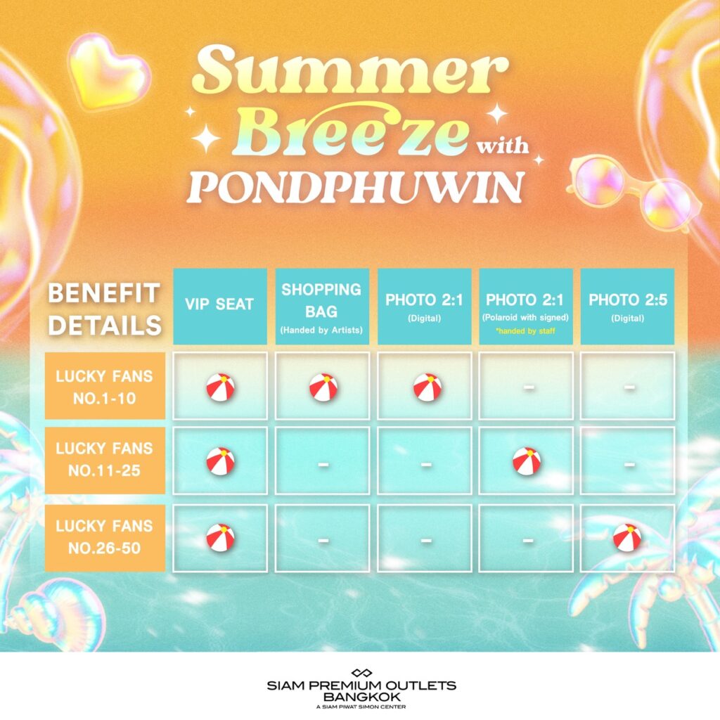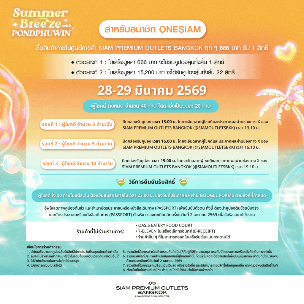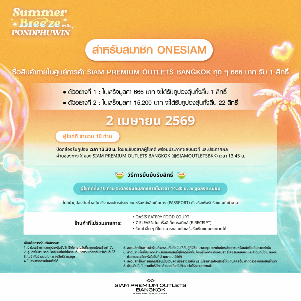 สมาชิก ONESIAM ร่วมลุ้นเป็น 1 ใน 50 LUCKY FANS เข้าร่วมกิจกรรมสุดพิเศษพร้อมรับของขวัญเอ็กซ์คลูซีฟจากสองหนุ่ม “ปอนด์ – ภูวินทร์” เพียงช้อปภายในศูนย์การค้า SIAM PREMIUM OUTLETS BANGKOK ทุก 666 บาท ต่อใบเสร็จ รับ 1 สิทธิ์ โดยลงทะเบียนเข้าร่วมแคมเปญ SUMMER BREEZE X PONDPHUWIN ผ่าน ONESIAM SuperApp เฉพาะวันที่ 28 – 29 มีนาคม 2569 และ 2 เมษายน 2569 เพียง 3 วันเท่านั้น! ยิ่งช้อปมาก ยิ่งเพิ่มโอกาสที่จะได้ใกล้ชิดศิลปินที่คุณชื่นชอบมากขึ้น