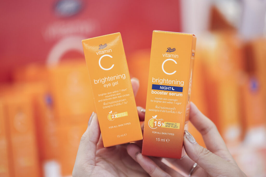 - Boots Vitamin C ไลน์อัปยอดฮิตอันดับ 1 ที่หลายคนยกให้เป็นไอเทมสามัญประจำโต๊ะเครื่องแป้ง ไม่ว่าจะเป็น Brightening Booster Serum, Brightening Moisturising Cream และ Brightening Body Serum โดดเด่นด้วยส่วนผสม Vitamin C & YUZU Extract จากเกาะเชจู ประเทศเกาหลี ที่มีวิตามินซีสูงกว่าส้มทั่วไปถึง 3 เท่า ช่วยให้ผิวกระจ่างใส ต้านอนุมูลอิสระ ลดเลือนจุดด่างดำ พร้อมเติมความชุ่มชื้น ครอบคลุมการดูแล ทั้งผิวหน้าและผิวกาย