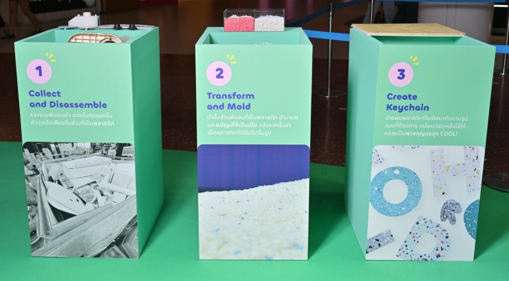 4. DIY พวงกุญแจพลาสติกรีไซเคิล Old Fan to New Charms: กิจกรรม DIY ปิดท้ายงานที่เปิดโอกาสให้ผู้ร่วมงานได้ทำพวงกุญแจที่ระลึกจากวัสดุรีไซเคิล โดยนำชิ้นส่วนพลาสติกจากพัดลมเก่าที่ผ่านการแปรรูปมาทำเป็นชาร์มหลากหลายสีและรูปทรง สำหรับตกแต่งพวงกุญแจในสไตล์ของตนเอง