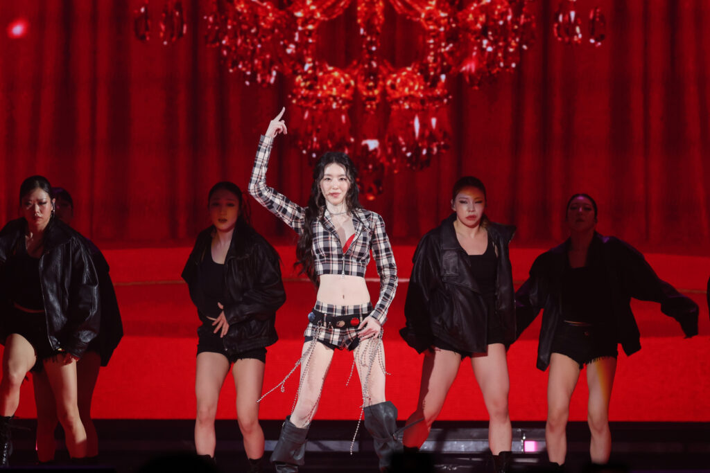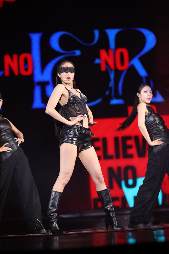 พอทักทายกันจบสาวๆ ก็ออกสตาร์ทชวนคนในฮอลล์สนุกไปกับทุกจังหวะดนตรีผ่านเซ็ตลิสต์ ‘LION’, ‘Love Tease’, ‘Reno (Feat. Colde)’ (โซโล่ของ MIYEON) รันเวทีต่อกับเพลง ‘화(火花)(HWAA)’, ‘Red Redemption’ (โซโล่ของ SHUHUA), ‘싫다고 말해 (Put It Straight)’ , ‘Revenge’ เรียกว่าชาว NEVERLAND ได้รันความสุขแบบนอนสต็อปกับ ‘Good Thing’, ‘ICE BLUE RABBIT’ (โซโล่ของ SOYEON), ‘Wife’, ‘Girlfriend’, ‘나는 아픈 건 딱 질색이니까 (Fate)’, ‘Crow’, ‘I Want That’, ‘POP/STARS’, ‘M.O.’ (โซโล่ของ YUQI)