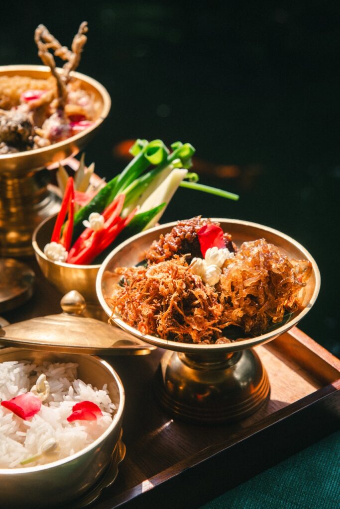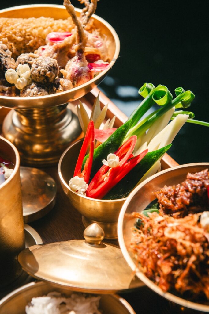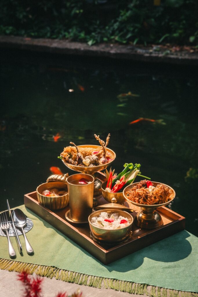 “ข้าวแช่ จิม ทอมป์สัน” นำเสนอข้าวหอมมะลิไทยที่นึ่งด้วยวิธีดั้งเดิม เสิร์ฟพร้อมน้ำลอยดอกไม้ออร์แกนิกในชามทองเหลืองอันงดงาม ข้าวแช่มาพร้อมเครื่องเคียง 7 ชนิด ได้แก่ ลูกกะปิชุบไข่ทอด ที่คั้นจากกะปิคุณภาพดีผสมสมุนไพรไทยหอมกรุ่น ไชโป๊วหวาน ทำจากหัวไชเท้าเชื่อมด้วยน้ำตาลมะพร้าวจนเคลือบเงาสวยงาม พริกหยวกสอดไส้ห่อไข่ลูกไม้ ยัดไส้หมูคุโรบุตะและกุ้งผสมสมุนไพร ห่อด้วยไข่ลูกไม้ออร์แกนิก ปลายัดไส้หอมแดง ใช้หอมแดงคัดพิเศษยัดไส้ปลาช่อนแดดเดียวปรุงรส หมูฝอย ทำจากเนื้อหมูฉีกปรุงด้วยน้ำตาลมะพร้าวท้องถิ่นและน้ำปลา พริกแห้งไส้ปลาหวาน พริกชี้ฟ้าแห้งยัดไส้ปลาแดดเดียวปรุงรสหวาน นำไปชุบแป้งทอดสีทอง และ ปลายี่สนหวาน ปรุงอย่างพิถีพิถันด้วยซอสหวานที่ดึงเนื้อสัมผัสนุ่มกำลังดีของปลาออกมาได้อย่างลงตัว นอกจากนี้ยังเสิร์ฟผักและผลไม้แกะสลัก อาทิ มะม่วงมัน แตงกวา กระชาย และพริกชี้ฟ้าสด ปิดท้ายด้วยของหวานซิกเนเจอร์อย่าง ส้มฉุนลูกหม่อนลิ้นจี่มะยงชิด เติมกลิ่นหอมด้วยผิวส้มซ่า ดอกมะลิออร์แกนิก พร้อมเติมความหวานสดชื่นด้วยไซรัปดอกไม้ออร์แกนิก