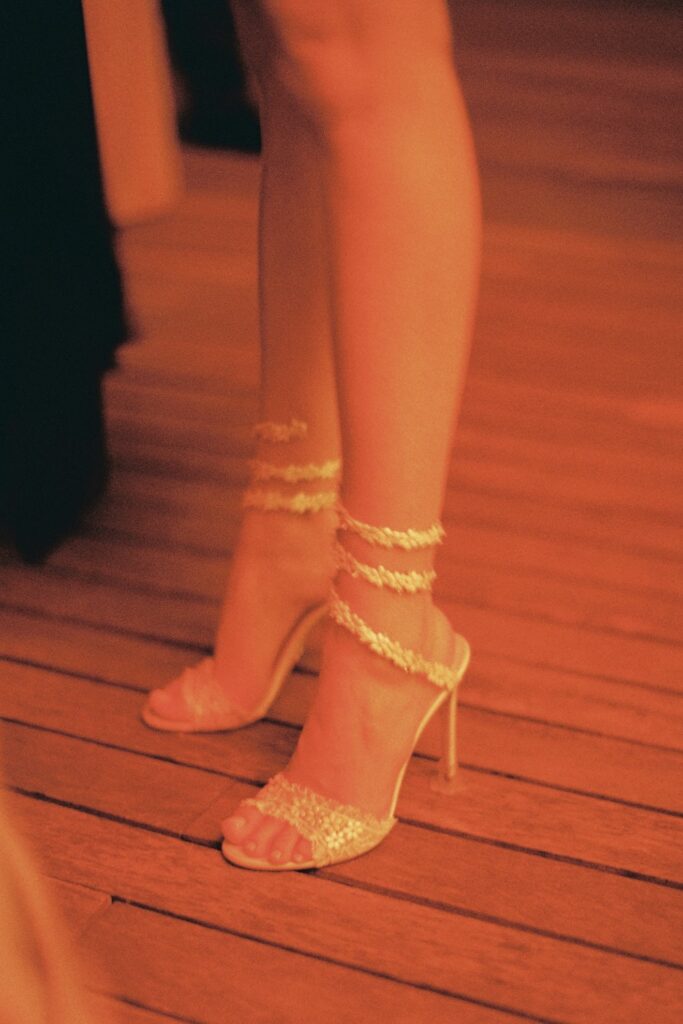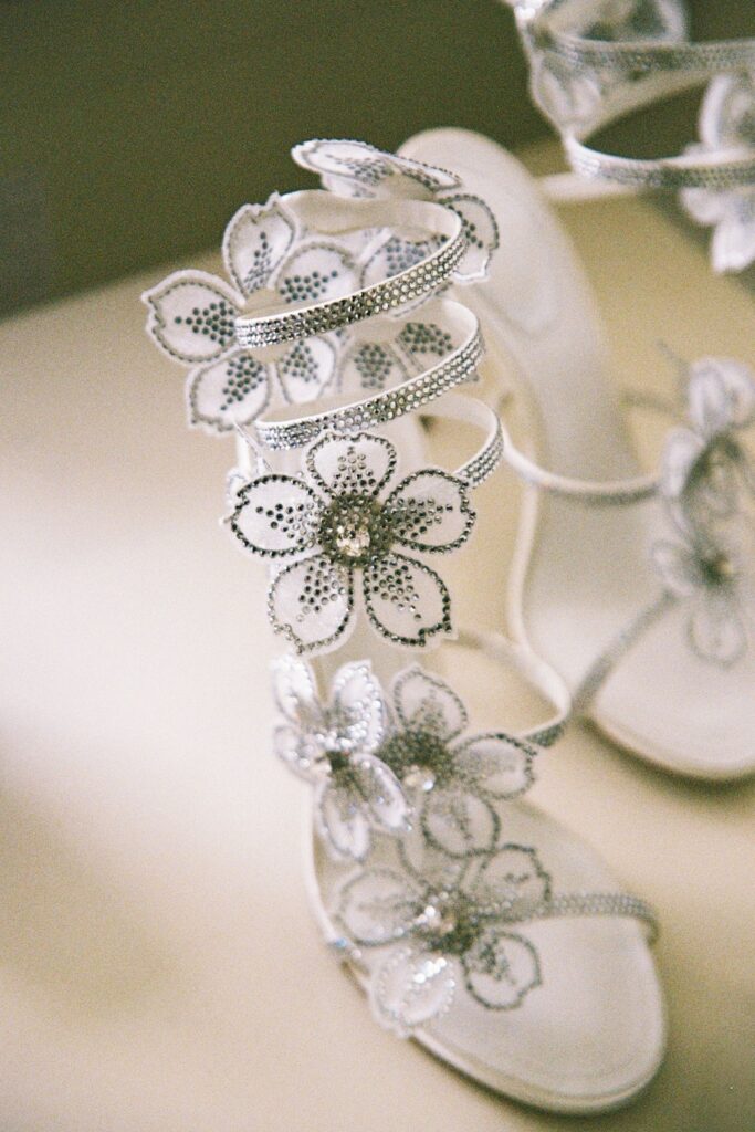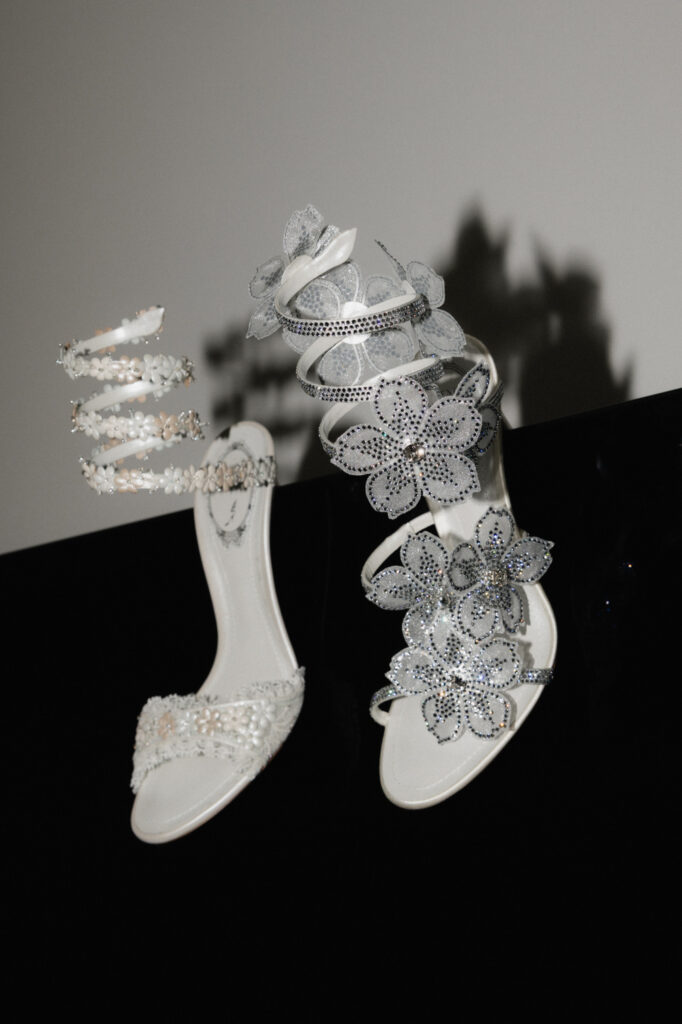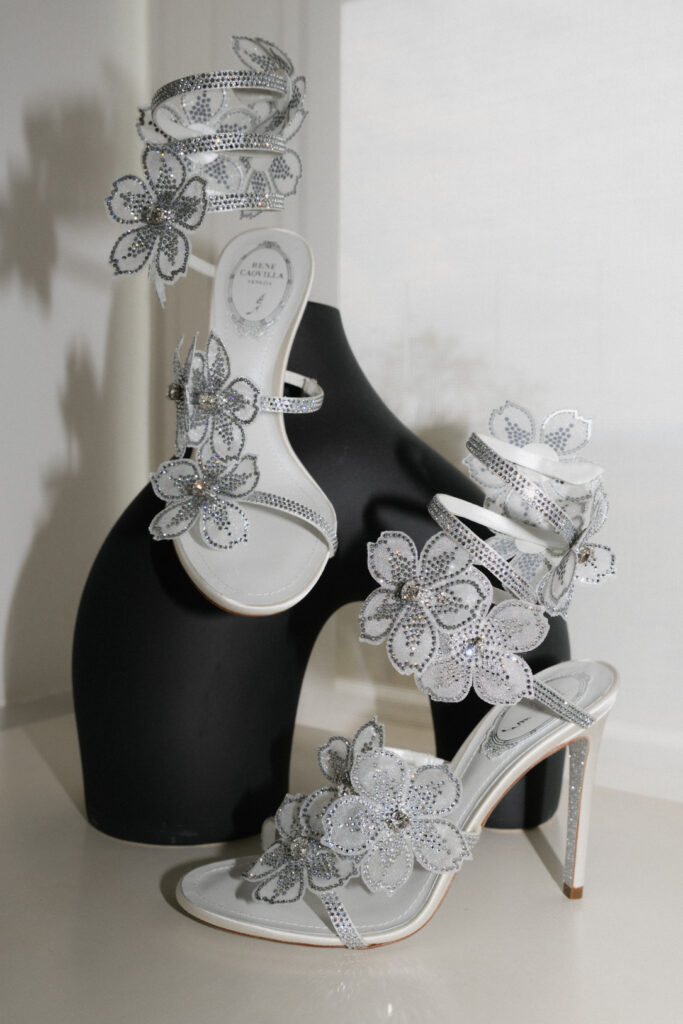 มิลลี่ได้ถ่ายทอดความงดงามของลุคเจ้าสาวผ่านรองเท้า 2 ดีไซน์ที่สะท้อนเสน่ห์อันแตกต่างกันอย่างลงตัว โดยดีไซน์แรกคือ René Caovilla Satin Floral Cleo Sandals รองเท้าไอคอนิกของแบรนด์ที่โดดเด่นด้วยสายพันรอบข้อเท้าอันเป็นเอกลักษณ์ ซึ่งได้รับแรงบันดาลใจจากรูปทรงอันสง่างามของงูในตำนาน การออกแบบที่ประดับด้วยดอกไม้ซาตินและคริสตัลระยิบระยับช่วยเพิ่มมิติแห่งความโรแมนติกและความหรูหรา ทำให้รองเท้าคู่นี้กลายเป็นหนึ่งในไฮไลต์ที่ช่วยเติมเต็มลุคเจ้าสาวให้ดูเปล่งประกายและน่าจดจำ