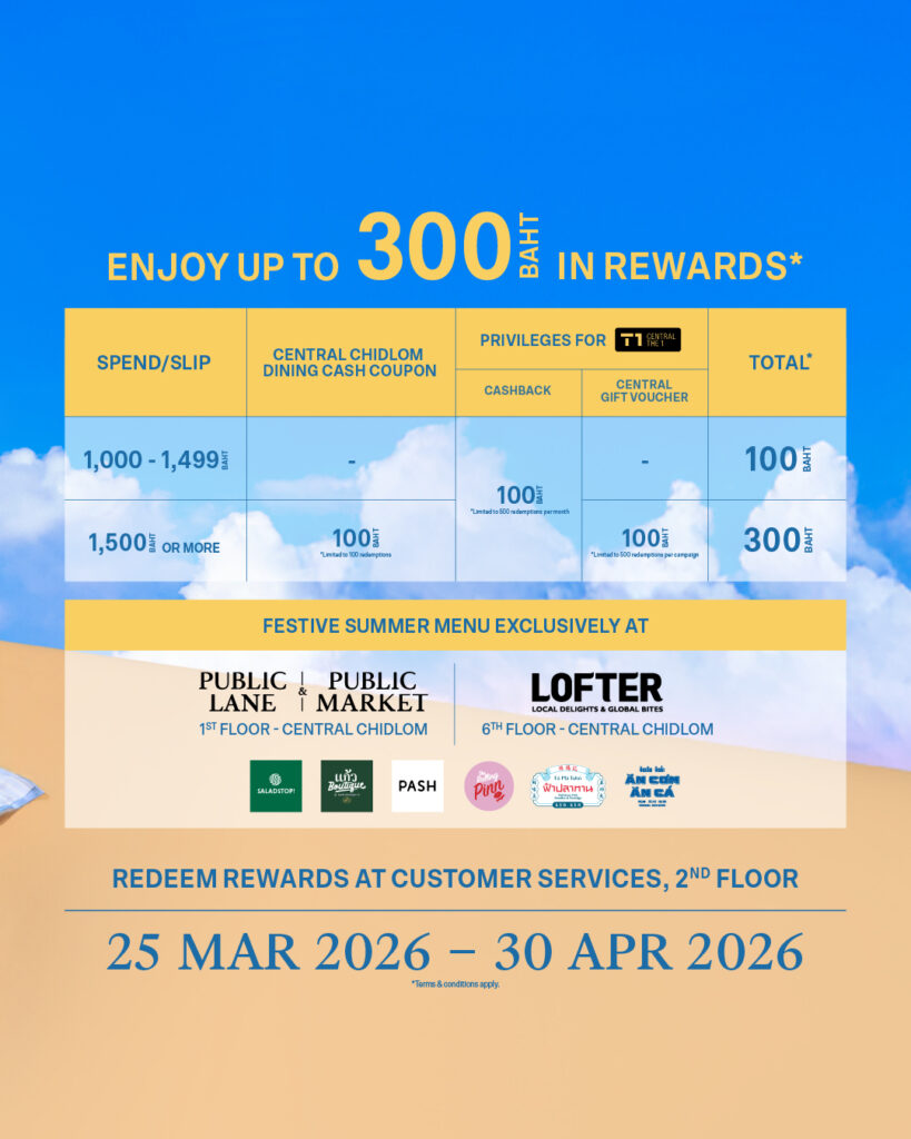 เติมเต็มความสนุกด้วยความอร่อย ความสดชื่นพร้อมบรรยากาศสนุกที่ Eathai ชั้น LG เสริมสิริมงคลด้วย กิจกรรม สรงน้ำพระ วันที่ 10 – 15 เมษายน 2569 เติมเต็มความสนุกโดย Live DJ TukTuk Radio วันที่ 12 – 13 เมษายน 2569 เวลา 12.00 – 14.00 น. และ 17.00 – 19.00 น. สดชื่นรับหน้าร้อนกับ Summer Flavours เสิร์ฟเมนูไทยคลายร้อนสุดพิเศษ อย่างแตงโมหน้าปลาแห้ง ข้าวเหนียวมะม่วง และมะยงชิดลอยแก้ว ตลอดเดือน และพลาดไม่ได้กับความอร่อยสุดเอ็กซ์คลูซีฟ เพียงสั่งอาหารและเครื่องดื่มครบ 400 บาทต่อใบเสร็จ รับฟรี! “ขนมชั้นลายผ้าไทย” ที่สะท้อนเอกลักษณ์วัฒนธรรมไทย (จำนวนจำกัด 60 สิทธิ์) วันที่ 12 – 14 เมษายน 2569