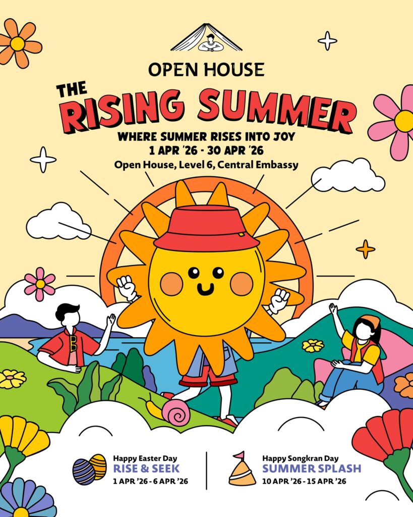 สำหรับศูนย์การค้าเซ็นทรัล เอ็มบาสซี ปักหมุดที่ Open House ชั้น 6 เปิดพื้นที่เป็นดินแดนแห่งความสนุก และแรงบันดาลใจในงาน “THE RISING SUMMER – WHERE SUMMER RISES INTO JOY” พิเศษสุดกับคาแรคเตอร์ “น้องซันซัน” (Sun Sun) ตัวแทนความสดใส ชวนทุกคนมารับพลังบวกและสร้างความทรงจำดีๆ ร่วมกัน พบกิจกรรมสร้างรอยยิ้มอย่าง Kites on the Rise ปล่อยจินตนาการไปกับเวิร์กช็อปประดิษฐ์ว่าวรูปทรงแมลงหลากสีสัน และ The Rising Music Stage เติมเต็มความละมุน ด้วยเสียงเพลงจากวงดนตรีสดสุดชิลล์ ทุกวันเสาร์-อาทิตย์ นอกจากนี้ยังพบกับกิจกรรมไฮไลต์ อื่นๆ ไม่ว่าจะเป็น Rise & Seek ผจญภัยตามล่าไข่ทองคำ (วันที่ 1 – 6 เม.ย. 2569) Golden Egg Hunt สวมบทนักสืบ ร่วมภารกิจตามหา “ไข่ทองคำ” ที่ซ่อนอยู่ ตามมุมต่างๆ ทั่ว Open House โดยมีคำใบ้จากน้องซันซัน Creative Workshop ปลุกวิญญาณศิลปินในตัวคุณกับเวิร์กช็อป Rise & Shine Egg Painting และ Harvest Bloom Basket ออกแบบตะกร้าเก็บขนมสุดน่ารัก