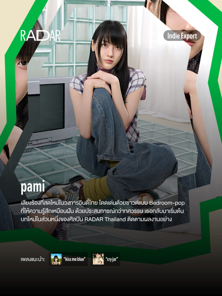 • pami เสียงร้องที่สดใหม่ในวงการอินดี้ไทย โดดเด่นด้วยซาวด์แบบ Bedroom-pop ที่ให้ความรู้สึกเหมือนฝัน ด้วยประสบการณ์กว่าทศวรรษ เธอกลับมาเริ่มต้นบทใหม่ในส่วนหนึ่งของศิลปิน RADAR Thailand ติดตามผลงานอย่าง “kiss me blue” และเพลงล่าสุด “cry jar” ได้ที่ Spotify