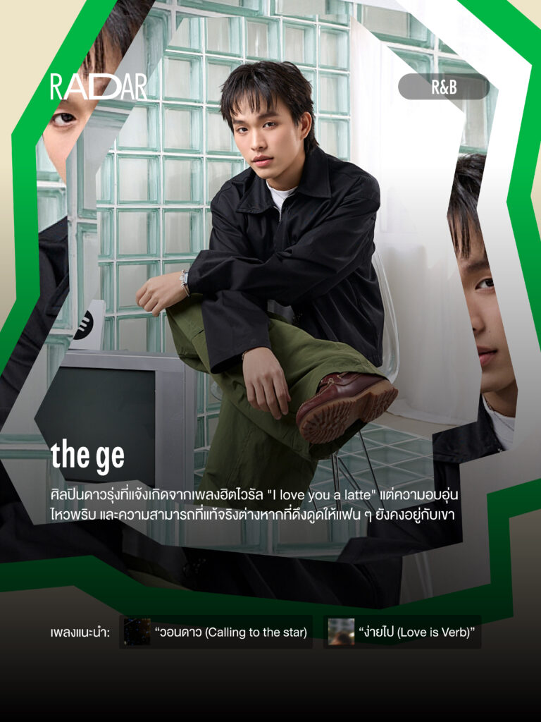 • the ge: ศิลปินดาวรุ่งที่แจ้งเกิดจากเพลงฮิตไวรัล “I love you a latte” แต่ความอบอุ่น ไหวพริบ และความสามารถที่แท้จริงต่างหากที่ดึงดูดให้แฟน ๆ ยังคงอยู่กับเขา ลองฟังเพลงอื่น ๆ เช่น “วอนดาว (Calling to the star)” และ “ง่ายไป (Love is Verb)