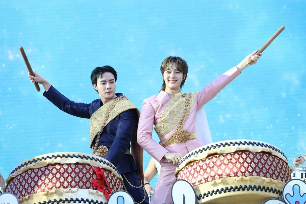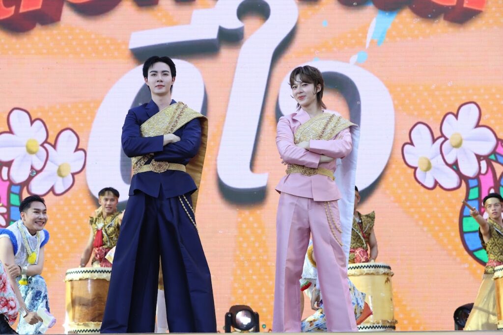 อีกหนึ่งโมเมนต์ที่เรียกเสียงกรี๊ดสนั่น คือการปรากฏตัวของคู่จิ้นสุดฮอต “ซี-นุนิว” ที่ขึ้นเวทีร่วมโชว์เปิดงานในชุดการแสดง “เพลงมงเท่งมง สงกรานต์ดีใจ” ถ่ายทอดเสน่ห์ของเทศกาลสงกรานต์ผ่านศิลปวัฒนธรรมไทยที่ถูกนำมาตีความใหม่อย่างร่วมสมัย โดยเปิดตัวอย่างทรงพลังด้วยการแสดงรวมกลองไทยที่สะท้อนถึงความกล้าหาญและความเข้มแข็ง ก่อนที่ “ซี-นุนิว” จะปรากฏกายในลุคสง่างามผสมผสานดีไซน์ร่วมสมัยเข้ากับความเป็นไทยได้อย่างโดดเด่น ร่วมตีกลอง สร้างภาพจำสุดตื่นตาให้กับผู้ชม ท่ามกลางเสียงและจังหวะที่กึกก้องหนักแน่น เปรียบเสมือนพลังแห่งการเริ่มต้นสิ่งใหม่ที่ยิ่งใหญ่ของปีนี้ จากนั้นในช่วงท้ายโชว์ทั้งคู่ยังร่วมสร้างสีสันด้วยการนำทีมนักแสดงออกสเต็ปเต้นส่งท้ายอย่างสวยงามพร้อมความสนุกสนาน สะกดทุกสายตาได้อย่างอยู่หมัด