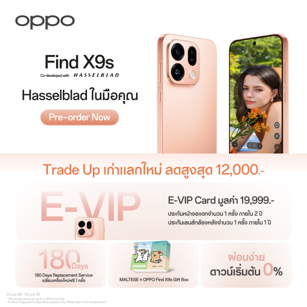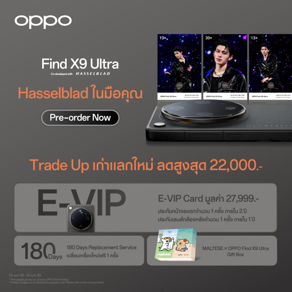 สำหรับผู้ที่สนใจเป็นเจ้าของ OPPO Find X9 Ultra และ OPPO Find X9s สามารถสั่งจองได้ตั้งแต่วันที่ 24 – 30 เมษายน 2569 พร้อมรับข้อเสนอสุดพิเศษในช่วง Pre-order และเป็นเจ้าของได้ง่ายมากยิ่งขึ้นด้วยโปรโมชั่น Trade-up นำเครื่องเก่ามาแลกเครื่องใหม่ ลดสูงสุด 22,000 บาท
