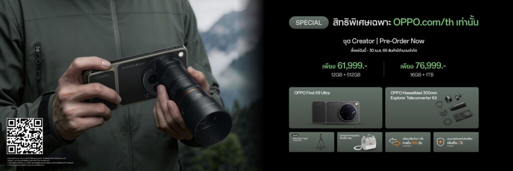 ออปโป้ ไทยแลนด์ เปิดตัว “OPPO Find X9 Ultra” สมาร์ตโฟนแฟลกชิปรุ่นใหม่ที่พร้อมพาไปสัมผัสประสบการณ์สมาร์ตโฟนกล้องระดับอัลตราที่แท้จริง ตอบโจทย์คนรุ่นใหม่ที่ชื่นชอบการไปคอนเสิร์ต เฟสติวัลและเหล่านักเดินทางที่ต้องการภาพถ่ายและวิดีโอคุณภาพระดับมืออาชีพในทุกเฟรม ชูจุดเด่นด้วยกล้องระดับอัลตราที่พัฒนาร่วมกับ Hasselblad แบรนด์กล้องระดับตำนาน กล้อง Hasselblad 50MP เทเลโฟโต้ ซูมออปติคอล 10 เท่า พร้อมยกระดับมาตรฐานภาพถ่ายภาพด้วยกล้อง Hasselblad 200MP คู่ บันทึกวิดีโอคมชัดพิเศษ เปิดตัวคู่กับ  OPPO Find X9s สมาร์ตโฟนสำหรับสายท่องเที่ยว ที่มาพร้อมกล้อง Hasselblad สามตัวคมชัดพิเศษ 50MP สนุกไปกับการสร้างสรรค์ได้อย่างง่ายดาย วางจำหน่ายในราคาเริ่มต้นที่ 29,999 – 69,999 บาท รวมถึงหูฟังไร้สายรุ่นใหม่ OPPO Enco Clip2, OPPO Enco Air5 Pro และสมาร์ตวอทช์ OPPO Watch X3 เพื่อเติมเต็มอีโคซิสเต็ม โดยมีเหล่าดาราและเซเลบริตี้ตัวท็อปของวงการ และอินฟลูเอนเซอร์มากมายที่มาร่วมสัมผัสประสบการณ์สมาร์ตโฟนกล้องระดับอัลตราที่ช่วยให้การบันทึกภาพจำออกมาสวยงามและมีชีวิตชีวาที่สุด สัมผัสประสบการณ์การถ่ายภาพและวิดีโอระดับมืออาชีพได้แล้ววันนี้ ณ OPPO Brand Shop ทุกสาขา และตัวแทนจำหน่ายทั่วประเทศ