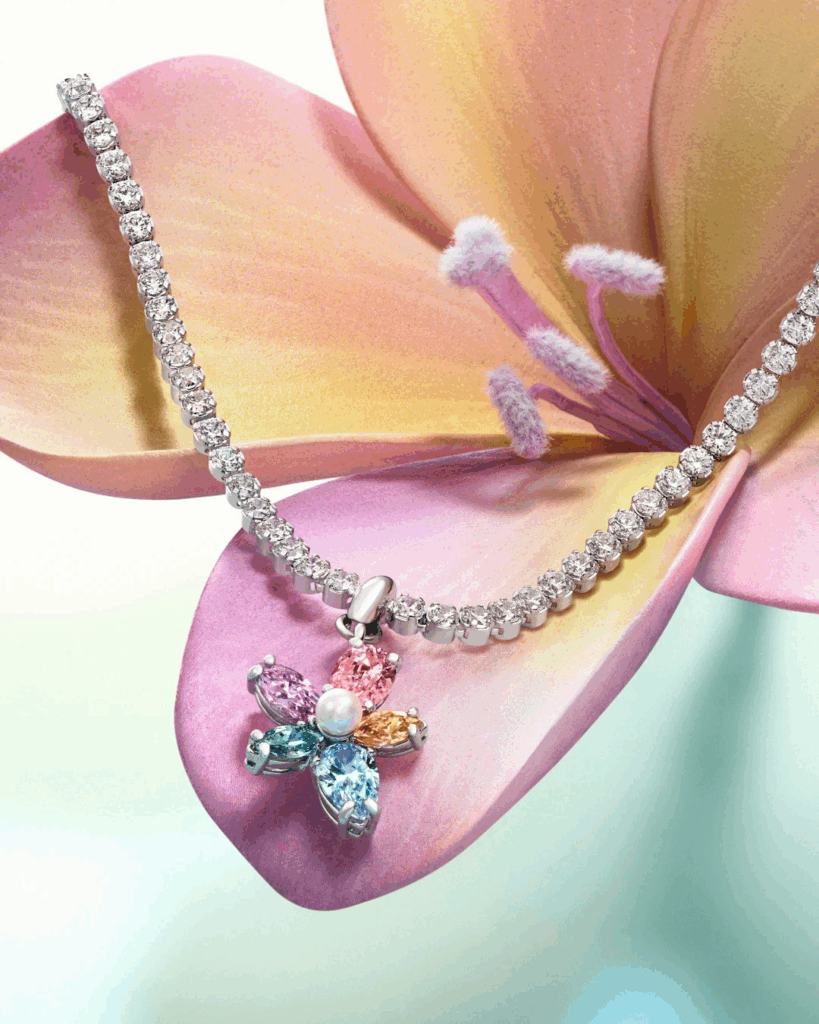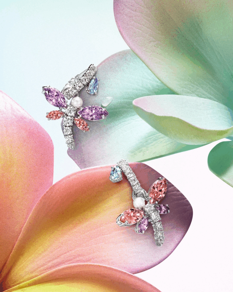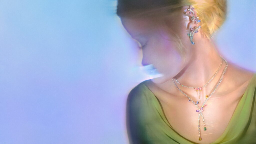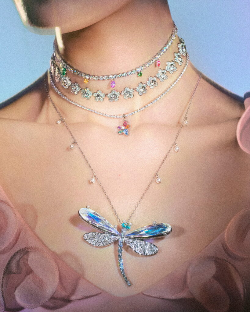 แรงบันดาลใจจากแมลงปอและดอกไม้ ทั้งในมิติที่สมจริงและนามธรรม ถูกร้อยเรียงเข้าด้วยกันเป็นการเฉลิมฉลองความมหัศจรรย์แห่งธรรมชาติผ่านประกายอันเจิดจรัส อัญมณีเฉดสีรุ้งและคริสตัลมุกละเอียดอ่อนช่วยขับเน้นความงดงามของเครื่องประดับที่มีเหลี่ยมเจียระไนหลากหลายรูปแบบและการผสานตัวเรือนต่างชนิดไว้ด้วยกันอย่างประณีต ขณะที่คริสตัลรูปผีเสื้อถูกนำมาตกแต่งบนชิ้นงานอย่างเข็มกลัด เครื่องประดับผม และรูปปั้นขนาดเล็กได้อย่างอ่อนช้อย